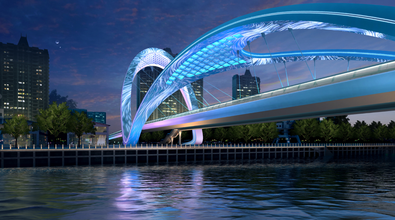 设计亮点:桥下护栏空间设置“微波测距感应护栏装置”光随人走动而同步变化,桥上的投影,设置没有人经过底下时,为静态或者缓慢动态的变化模式,当有人经过区域时,投影区域的色彩及图形发生变化,与之互动,但频率不能影响行车安全,人仿佛走进了梦幻世界,聆听着流动的音符,光与影,重现地域历史文化,重拾这座城市对于它的记忆,将串成两岸的魅力动线,打造美丽生态长廊,建造一座最具人气与活力的城市枢纽。