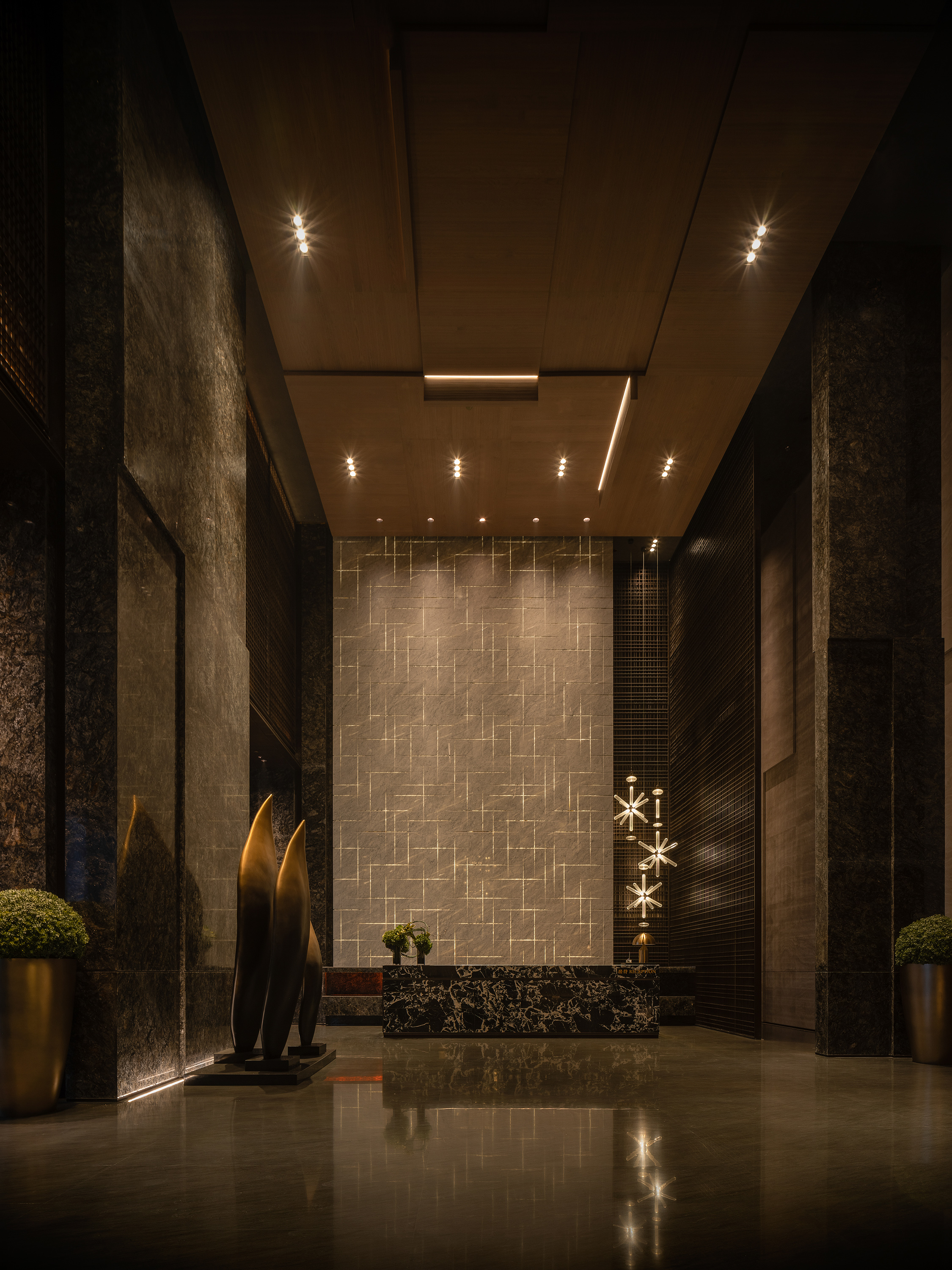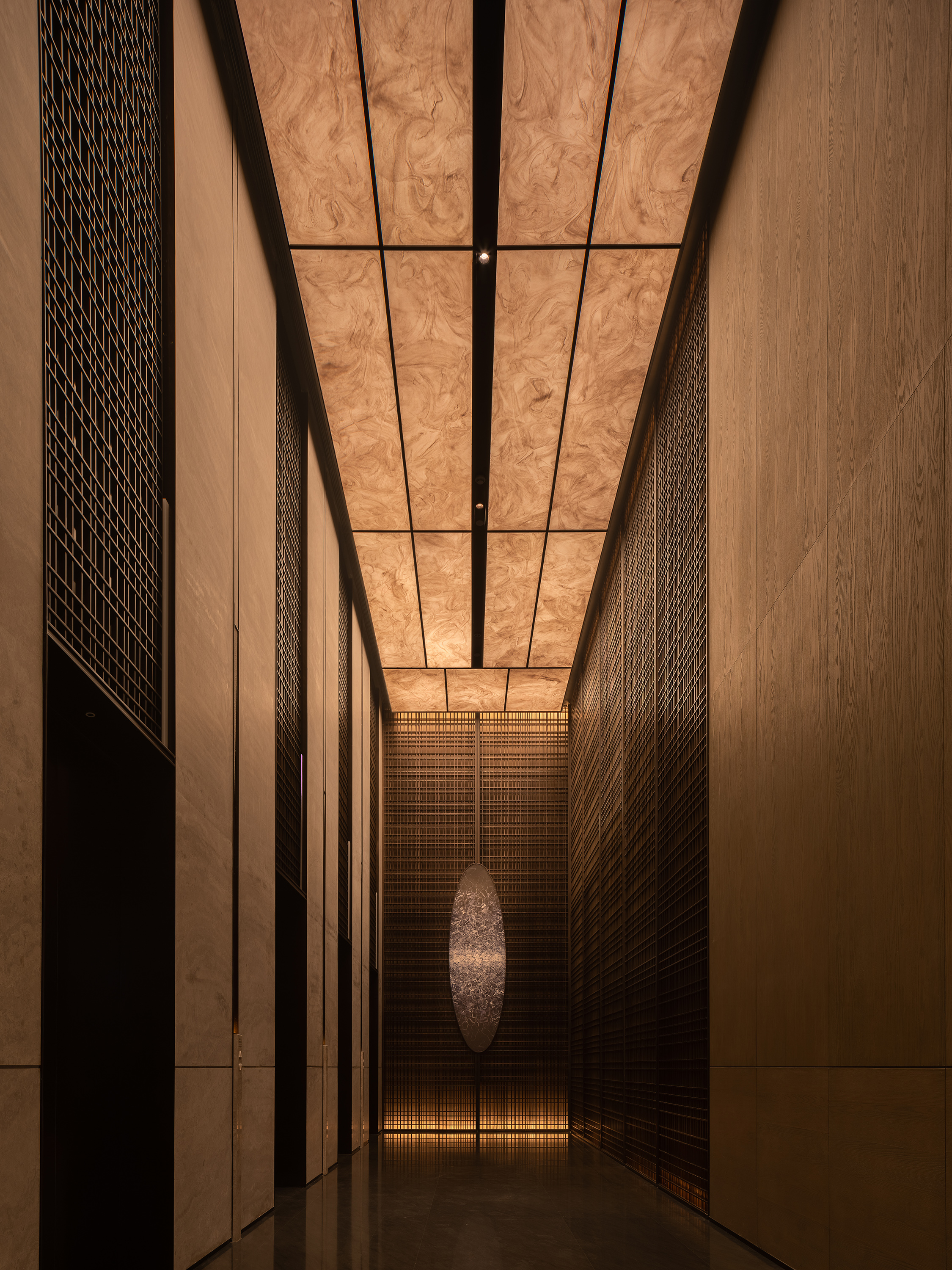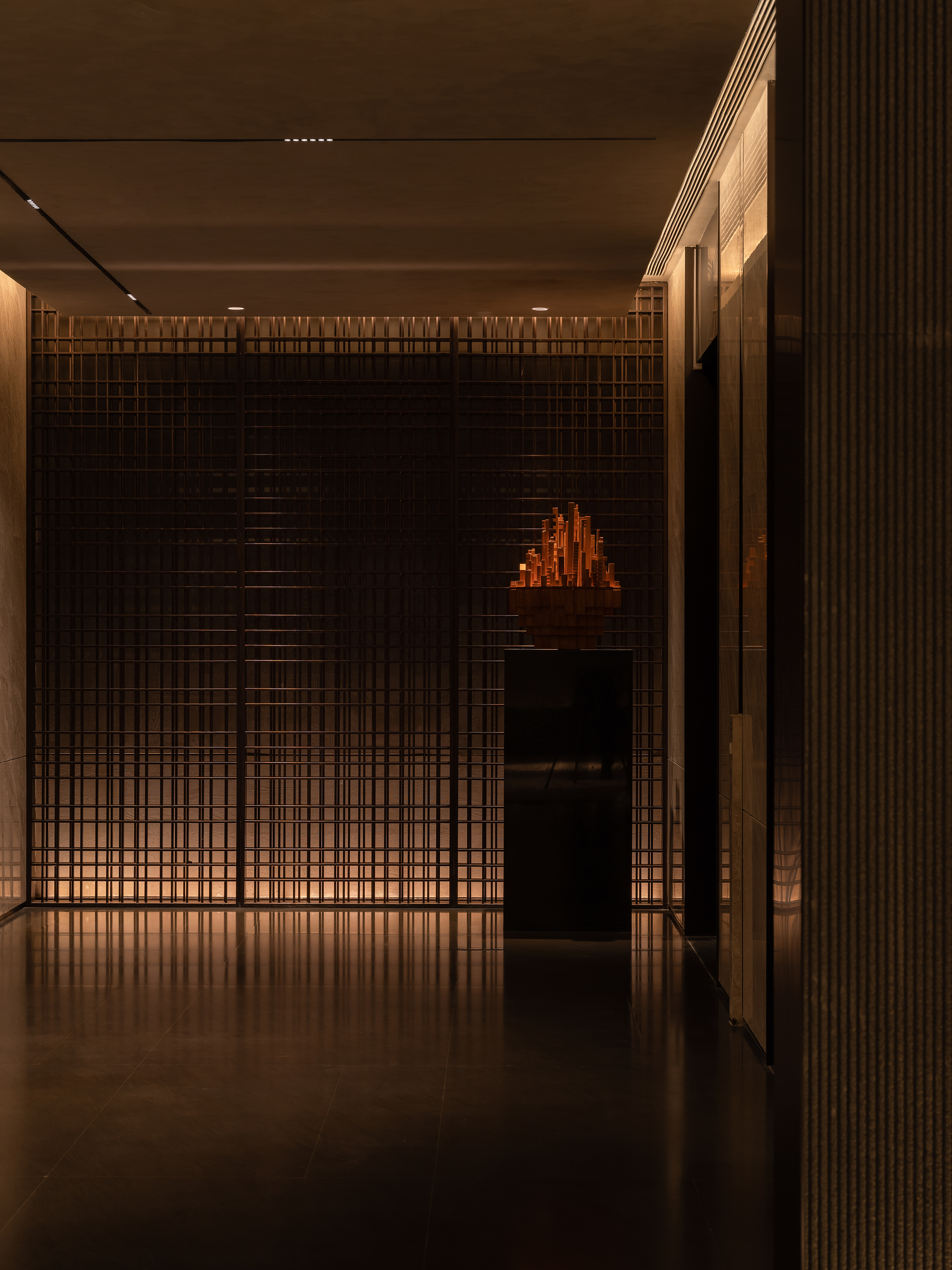 电梯厅空间体块穿插,石材墙面,格栅屏风立面虚实变化,地埋上照灯照线性灯内外设置,表现空间关系和层次,顶部灯箱三面发光嵌套石材立面,均匀柔和的灯光能够提供一个放松的氛围,并表达会所对所有到来的客人的诚挚欢迎。