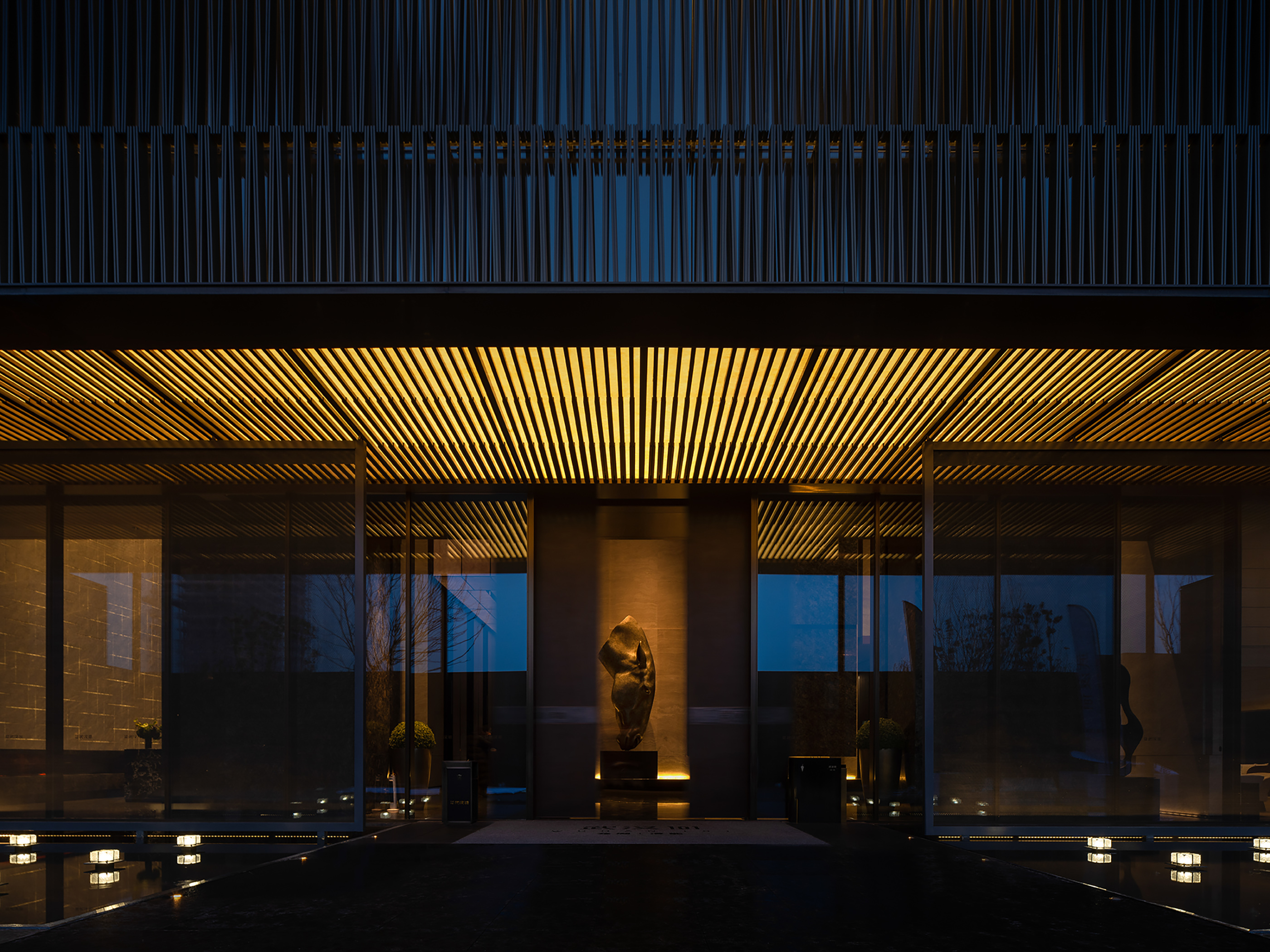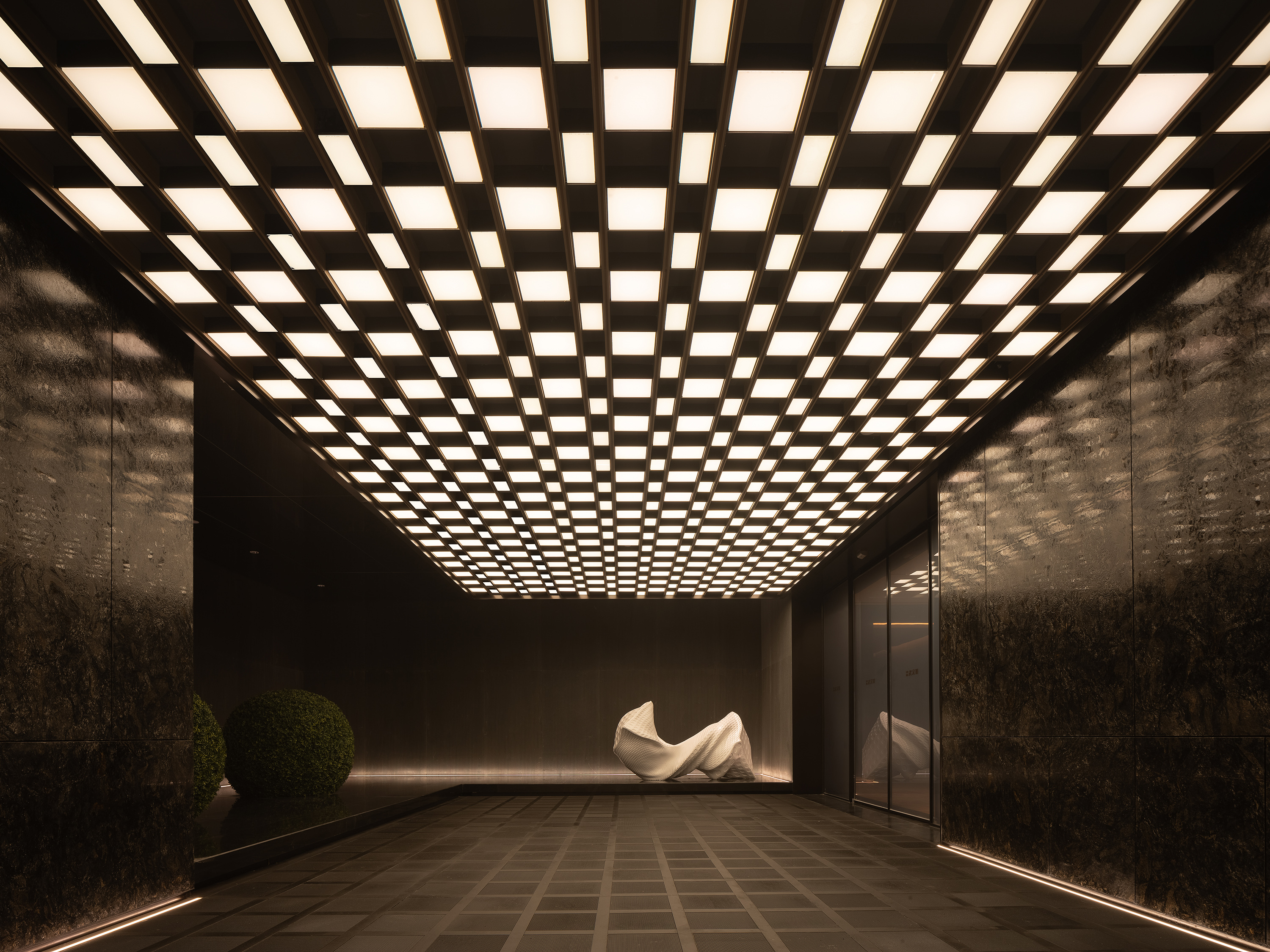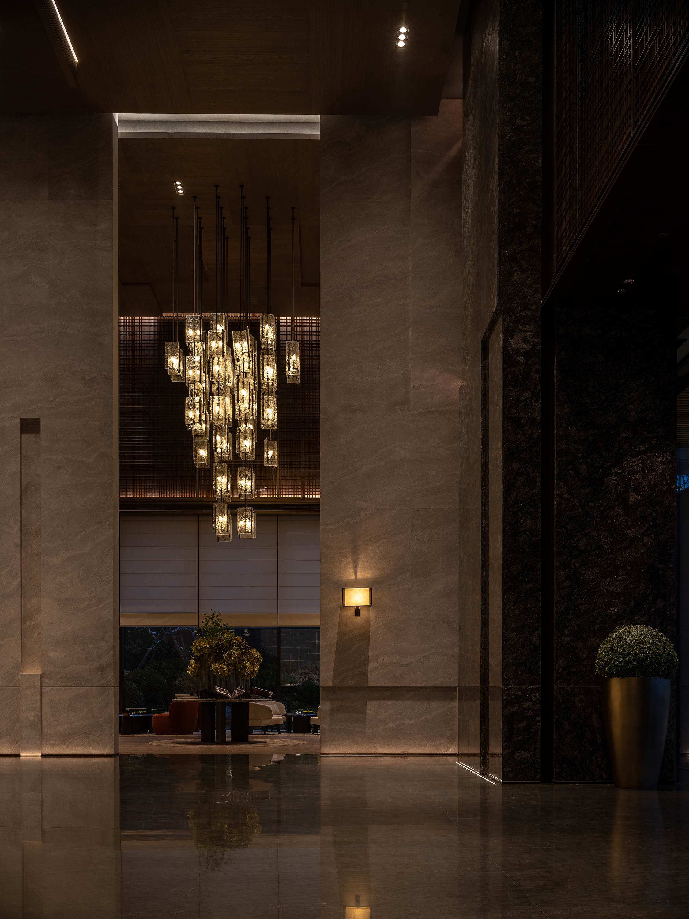 电梯厅空间体块穿插,石材墙面,格栅屏风立面虚实变化,地埋上照灯照线性灯内外设置,表现空间关系和层次,顶部灯箱三面发光嵌套石材立面,均匀柔和的灯光能够提供一个放松的氛围,并表达会所对所有到来的客人的诚挚欢迎。