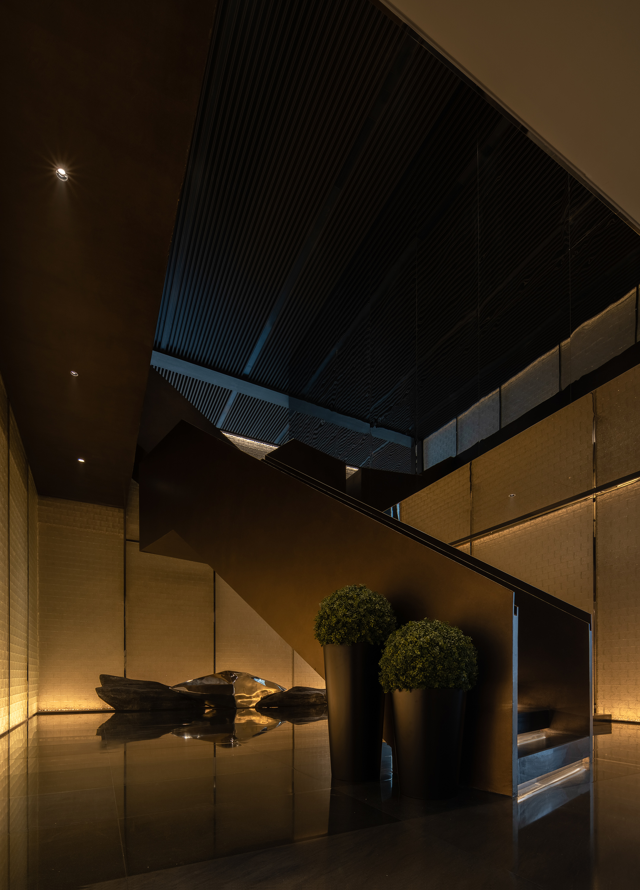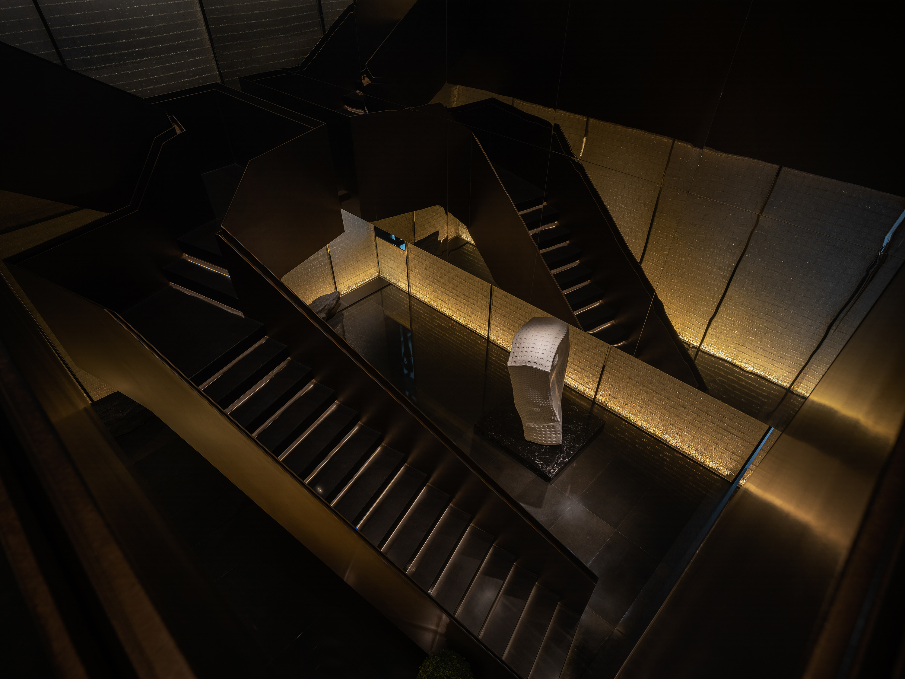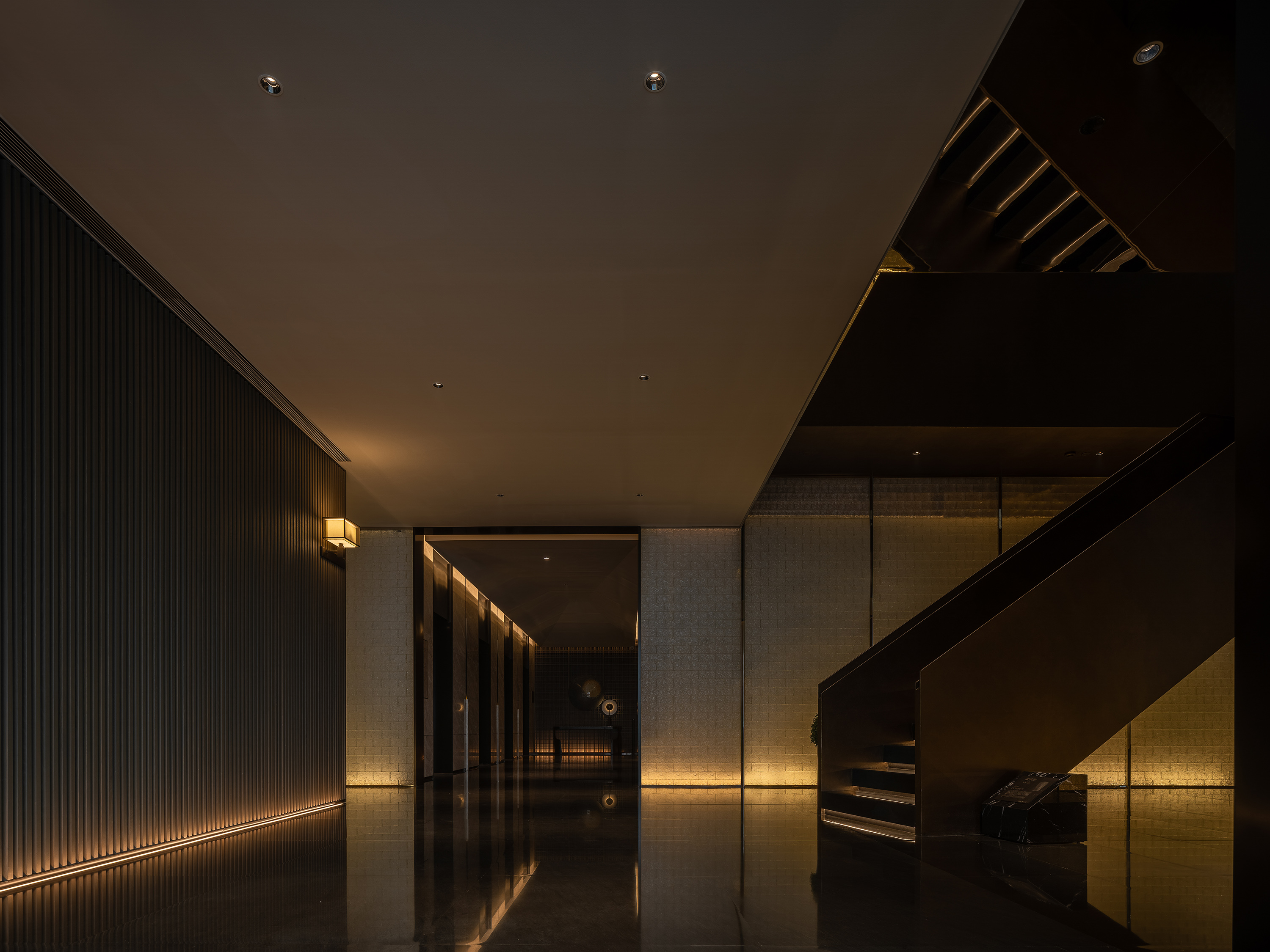 会所内部楼层挑空通道,黑色悬挑楼梯学列线性灯与冰雕式玻璃砖墙面面光,空间材质对比与灯光和线面的结合让空间更具戏剧性和电影场景感。