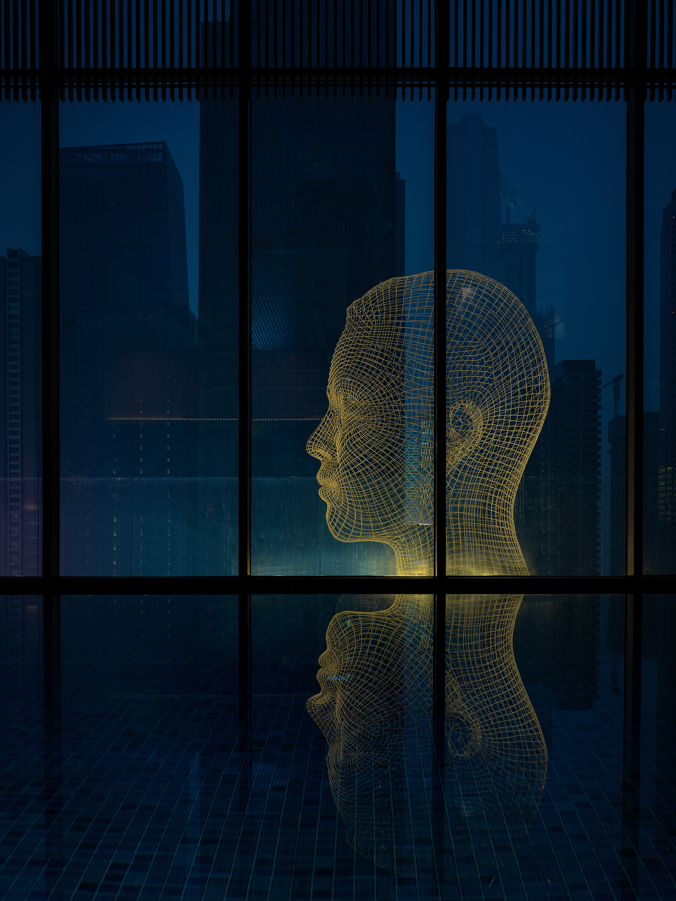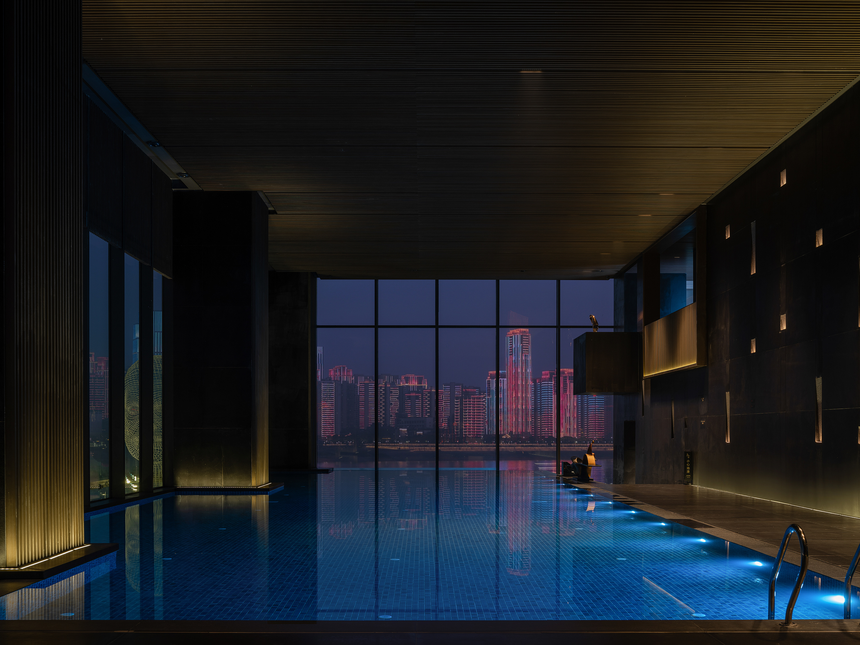 无边泳池室内灯具地位设计满足基本功能性照明氛围宁静;泳池外部灯光突出室外雕塑,通过明暗关系,将无边的空间延申到繁华都市风景,让人身处其中,不知边界从何处开始,又在何处终了。