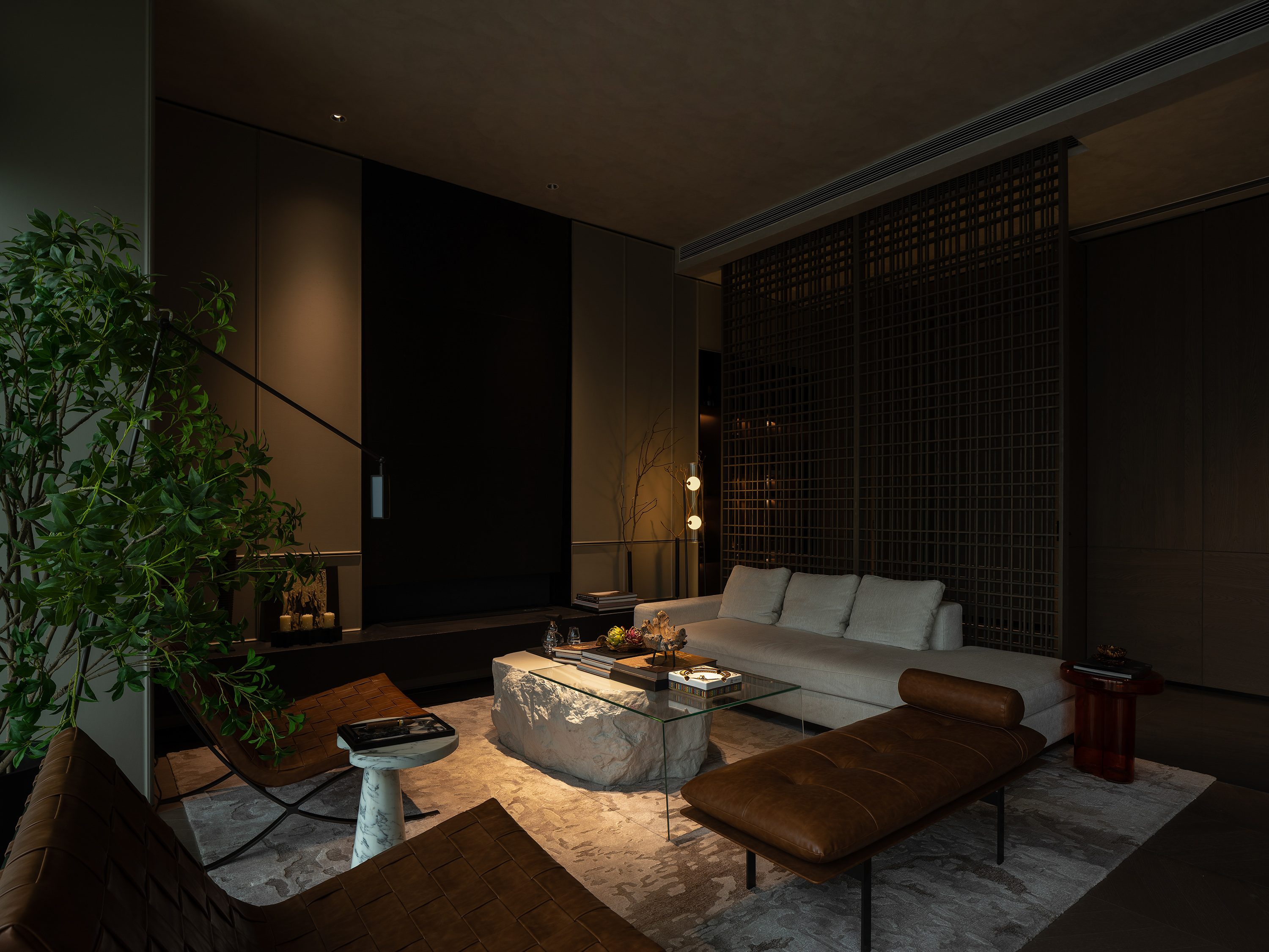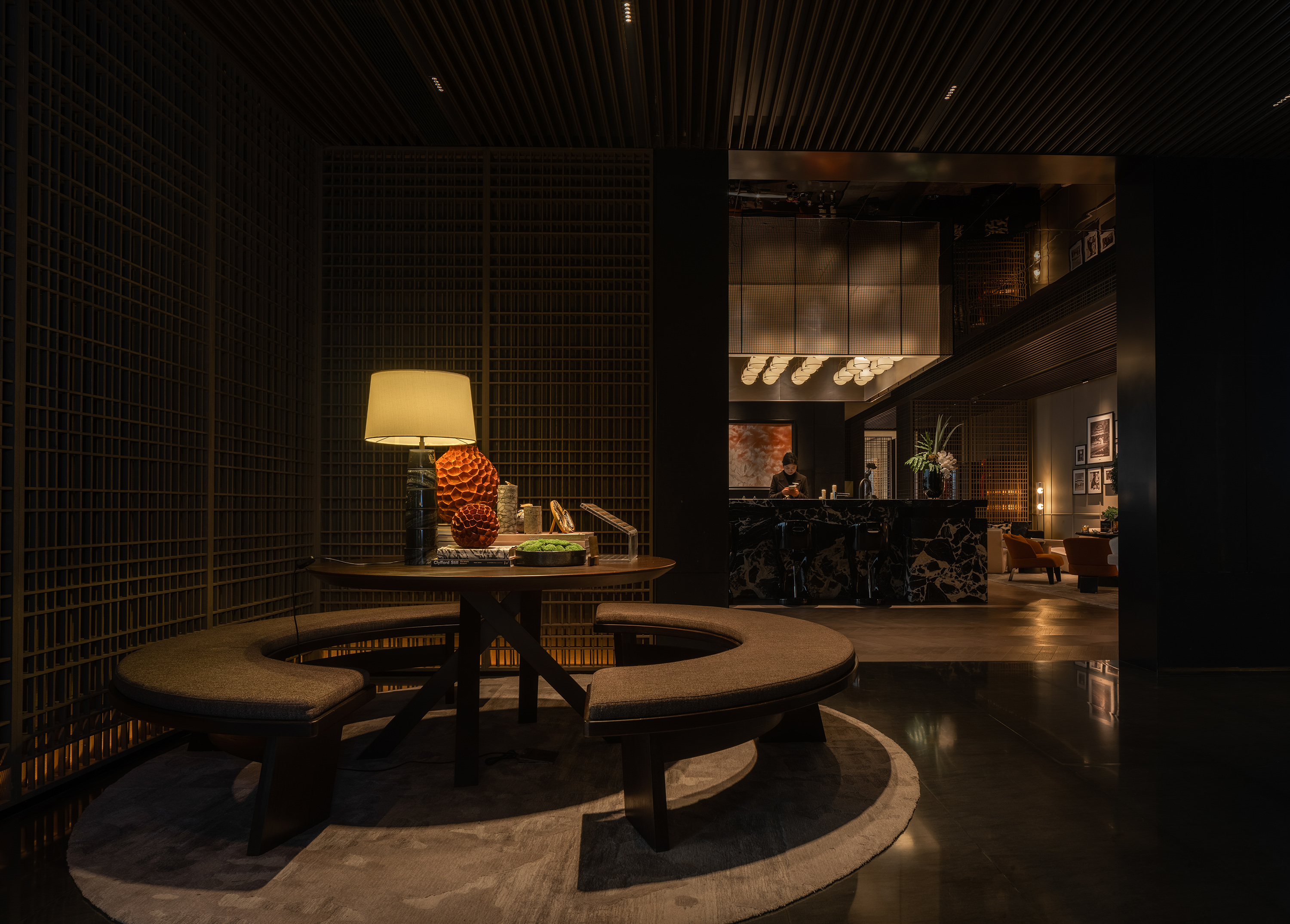 会所接待区,筒灯有序列结合天花隐藏设置通过调光与台灯亮度形成对比,表现空间色彩与层次,营造空间静谧、隐贵、侘寂、高级感。