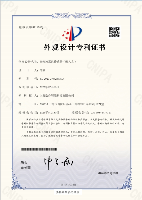 拥有毫米波雷达传感器外观设计专利以及多项基于雷达的智能感控实用新型专利。