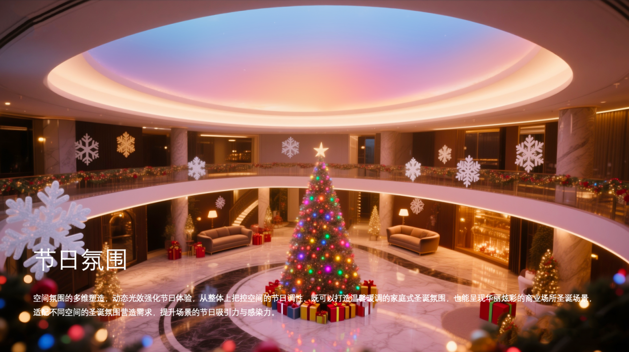 智能场景引擎与时间感知算法:系统可根据真实时间自动切换场景(如清晨“破晓之光”、夜晚“璀璨星河”),实现无人化智能运营。