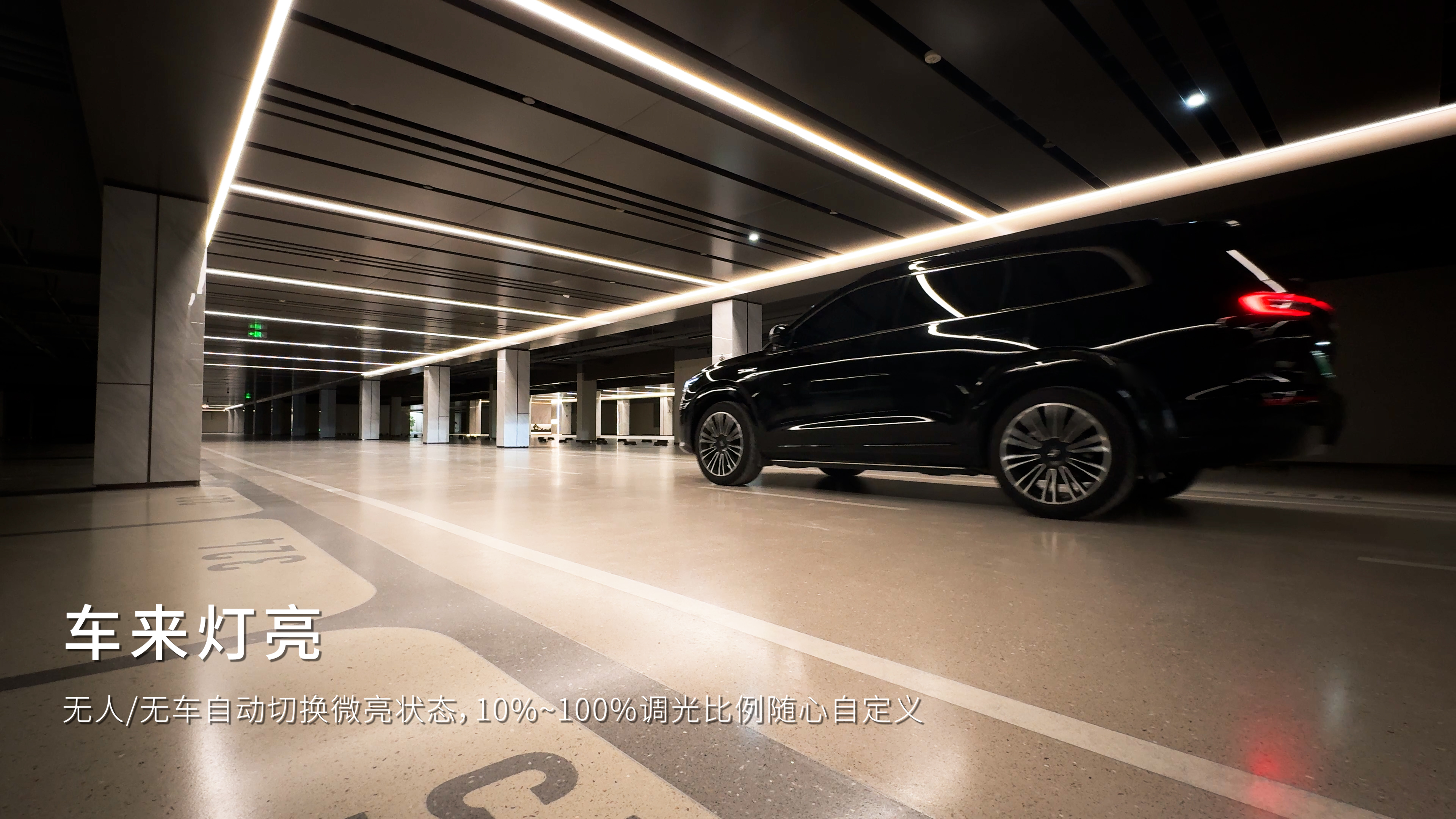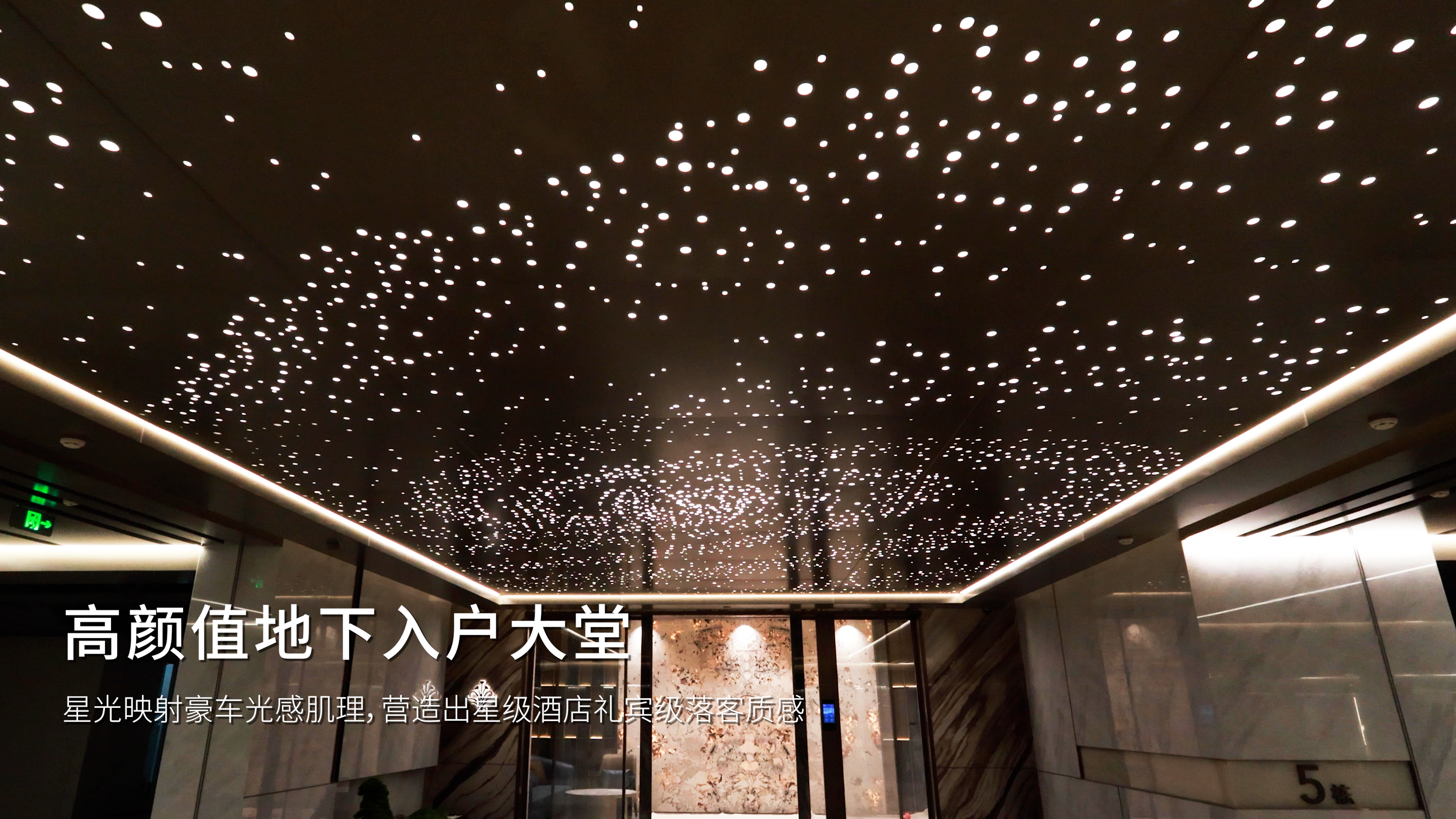 星网天合打造的智慧地库,从坡道入口开始就集聚仪式感,侧墙的石材岩板与竖向灯带的设计相结合,随着车辆的行驶轨迹,两侧灯光犹如星光大道般逐排点亮,自动调节亮度与星空穹顶交相辉映,追光一路随行,让归家如同穿越时光一般梦幻;车辆行驶在过道,通过智能感应与0-100%亮度无极调光,实时感应人车流动情况,提前点亮前行的灯光,并根据实际需求自动调节照明亮度和覆盖范围,精准调节每一刻的光与影,带来无与伦比的视觉享受;地下光厅星空顶铝板延展星幕尺度,打造一整片“星空”,让归家之旅在生活感与仪式感间自在流动。高阶色系铝板镶嵌星空团,中间楼栋单元号由发光字符框嵌入,平整而又细腻的设计,结合泛光照明设计,呈现出一幅栩栩如生的画卷。