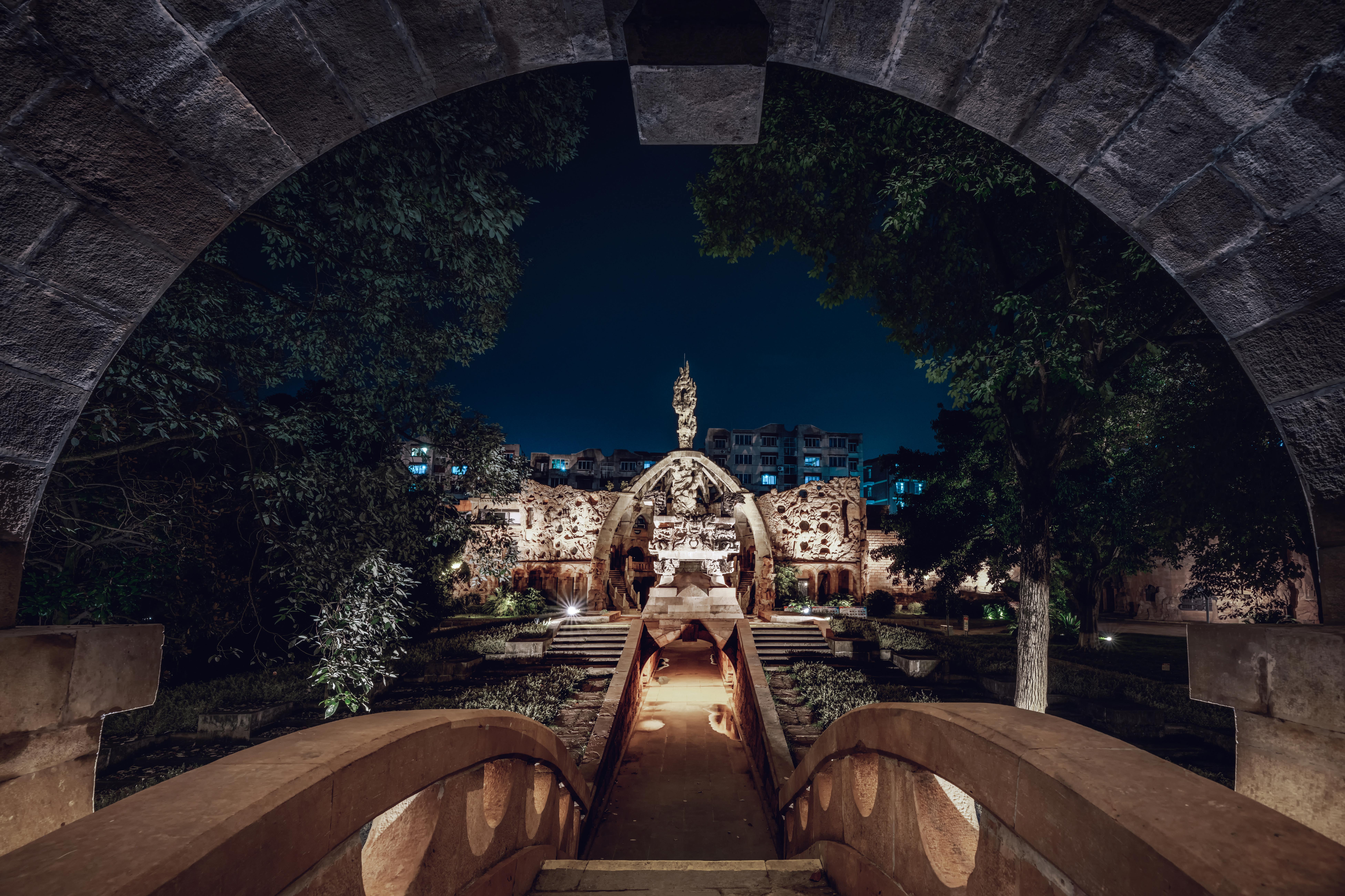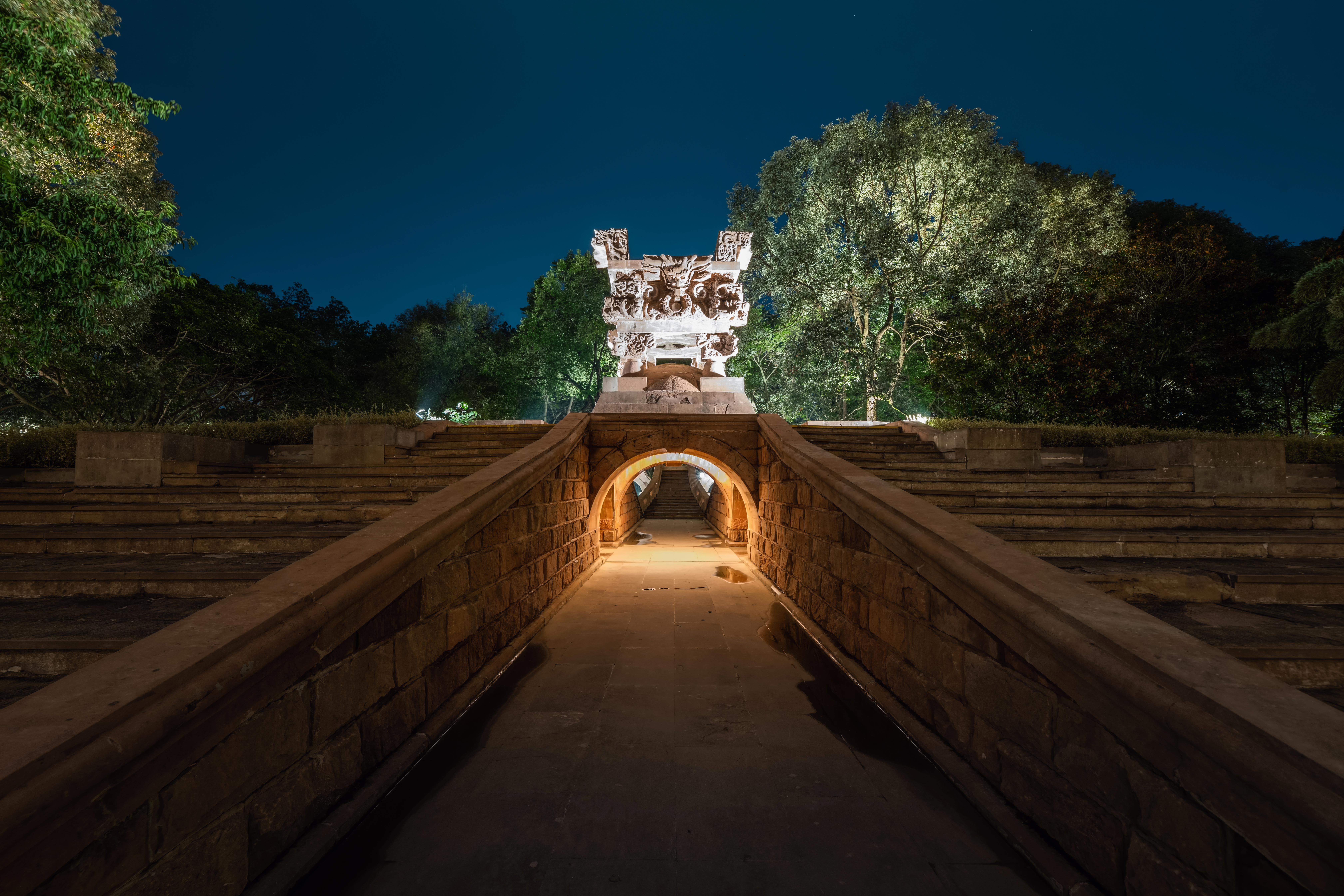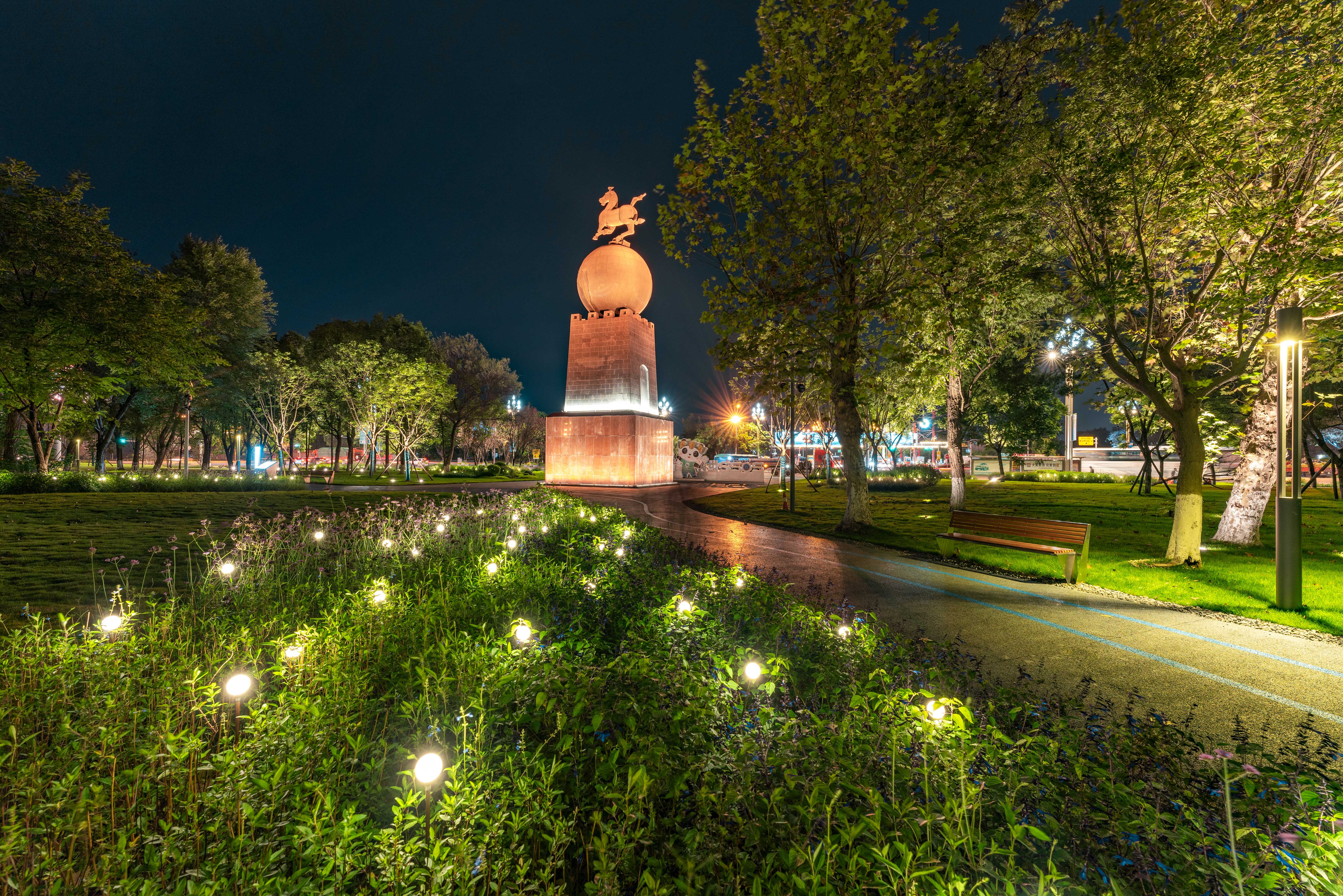 金色的马踏飞燕雕像在灯光的加持下绽放出辉煌的光芒,昭示性极强。通过线性投光灯对花径边缘的勾勒,即使在夜晚也能清晰的看到花团锦簇的景致。花团中亮起的一颗颗“小星星”,酷似夏夜萤火,增添了几分灵动。