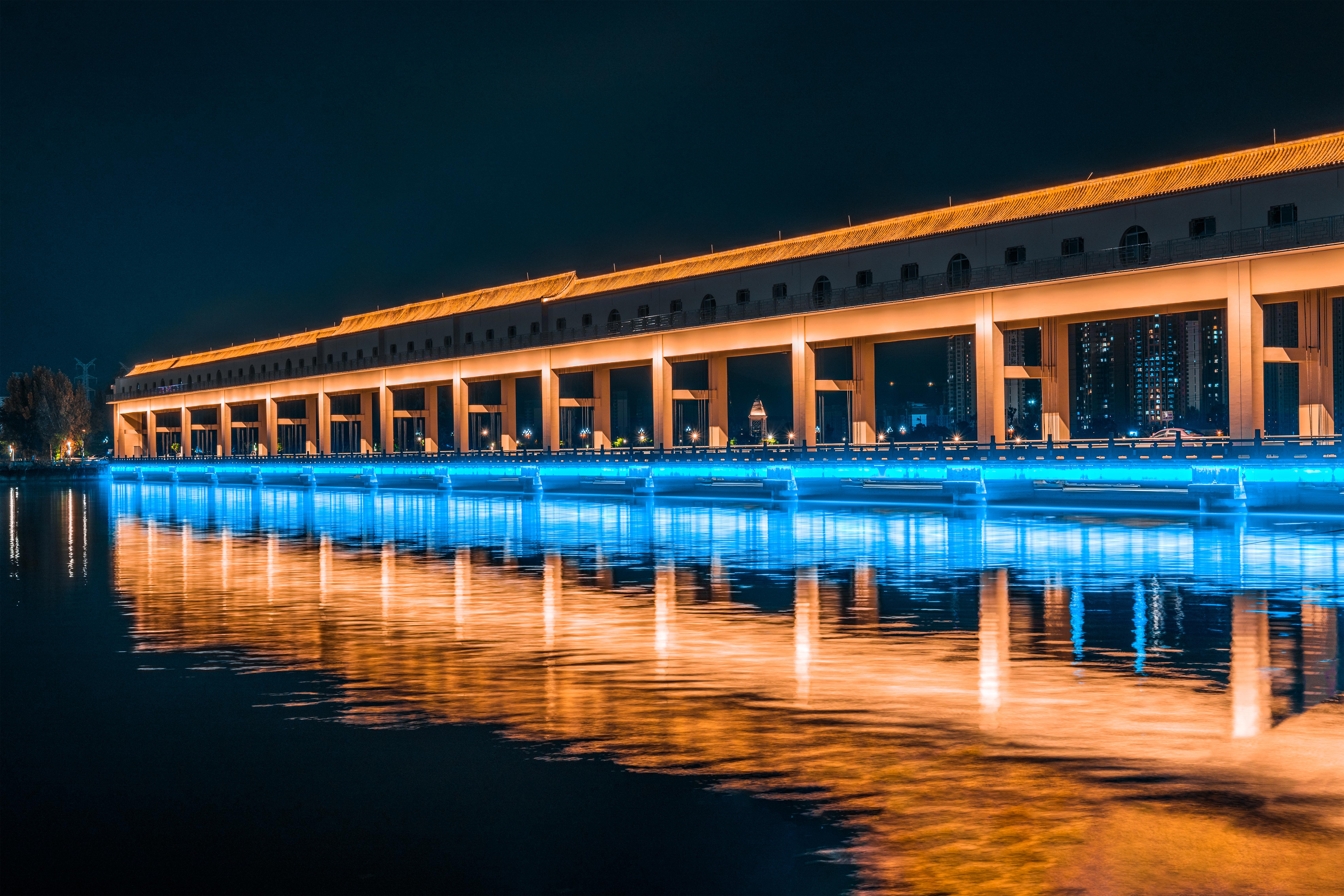雄跨绵远河的柳稍堰闸桥,采用蓝色的洗墙灯将水中倒影与桥体分割开来。平静的水面好似一面镜子,上下两条平行光影让整座闸桥在夜晚也格外清晰、雄壮。
