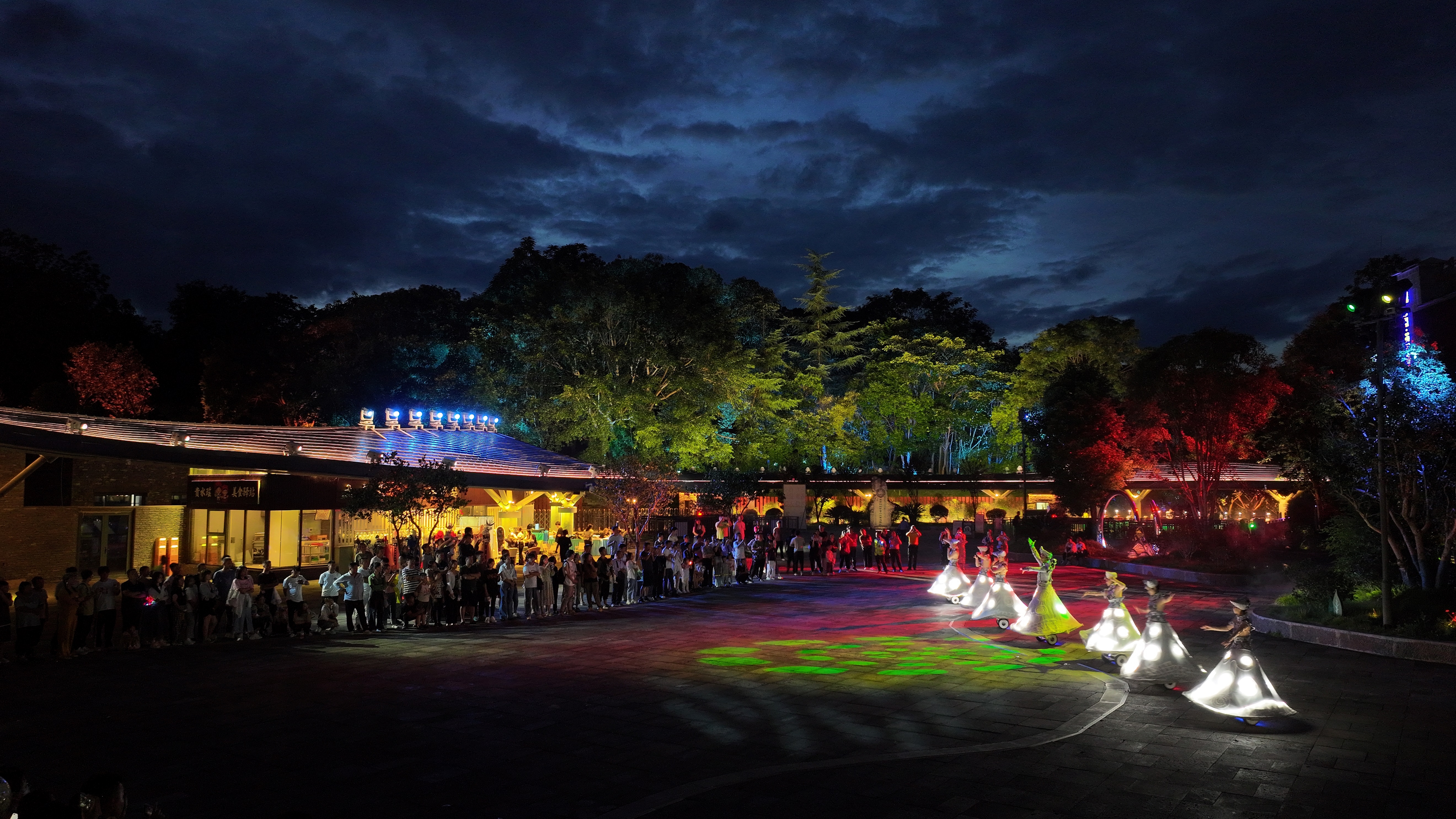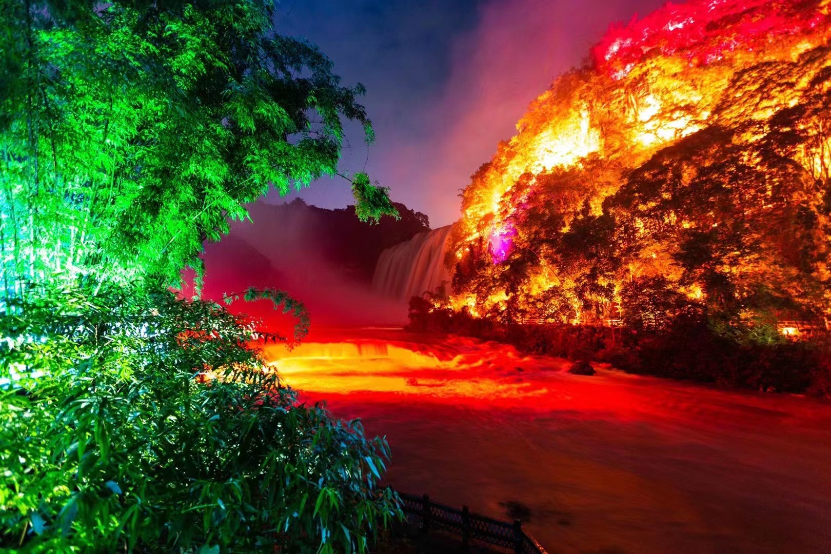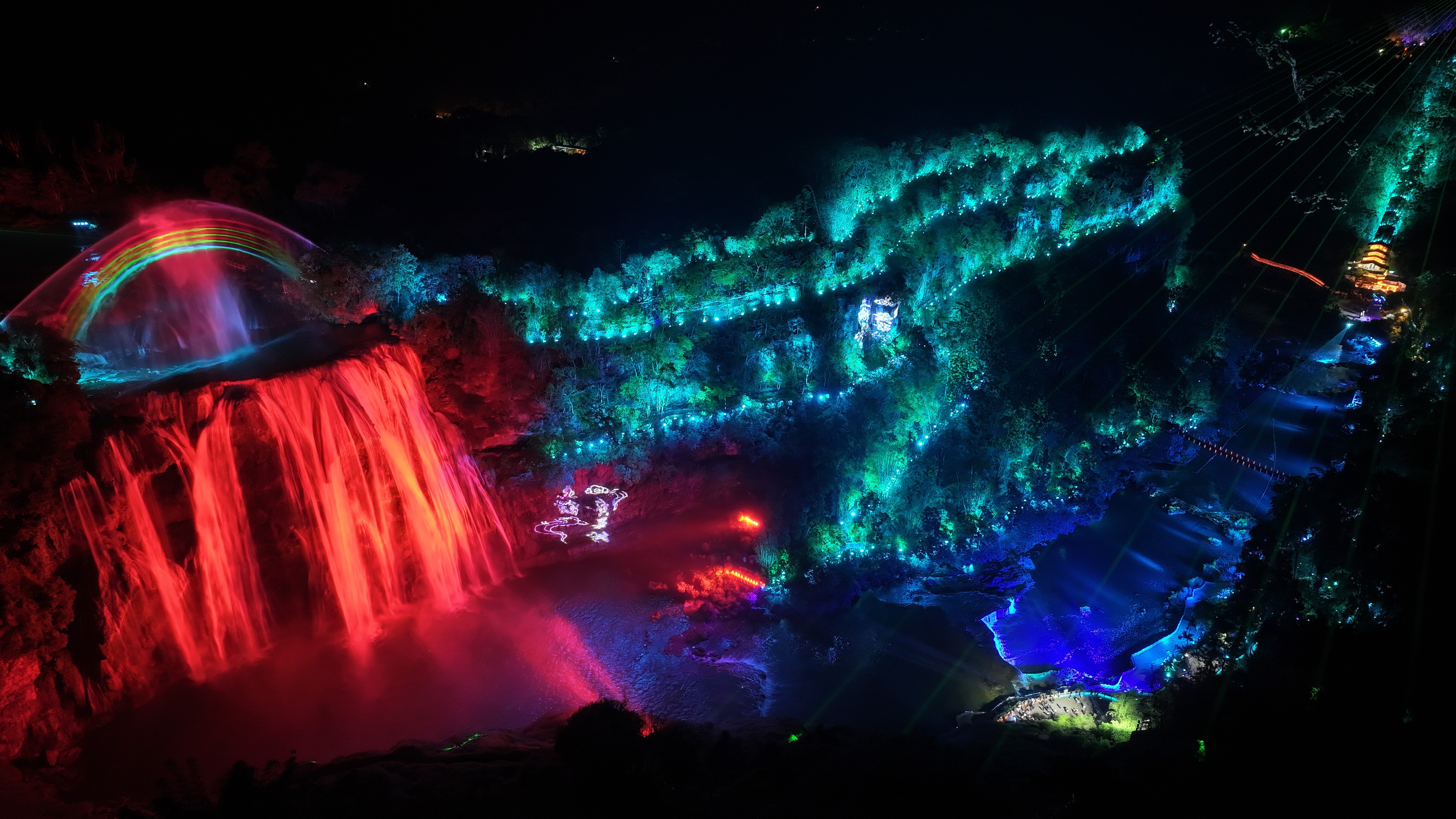 黄果树夜游项目是国内首个以5A级自然峡谷景区为载体打造的沉浸式体验梦幻光影秀;主要范围包括大牌坊、瀑布景区入口广场、入口通道、盆景园、大扶梯入口广场、大扶梯、铜鼓广场、竹林、微光森林、瀑布观景台、瀑布两侧大峡谷山体、陡坡塘大桥等;游览路线全长2380米。项目由10 余项光影互动体验和真人演艺表演构成,为游客带来独具“黄果树风情”的贵州民族文化旅游体验。