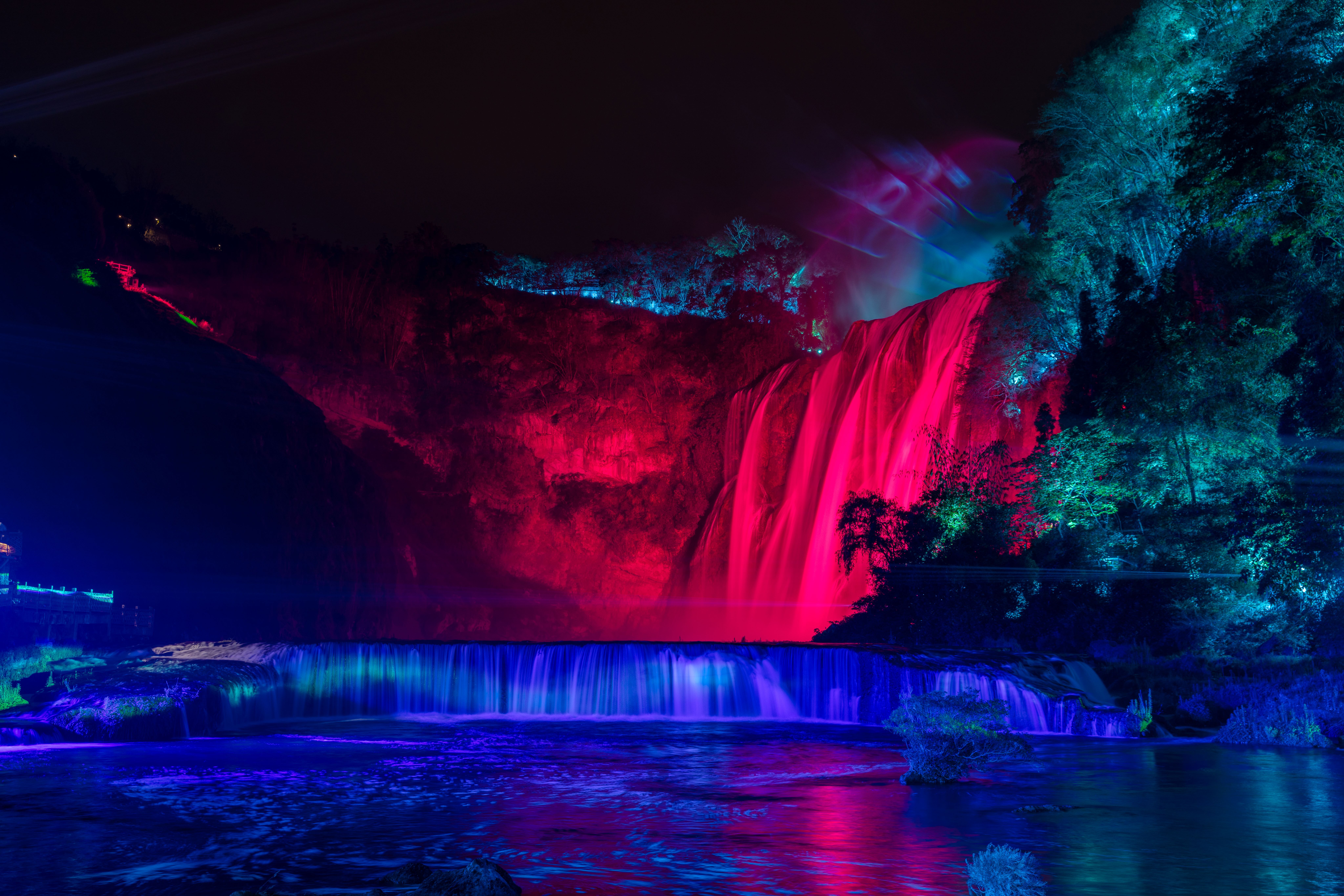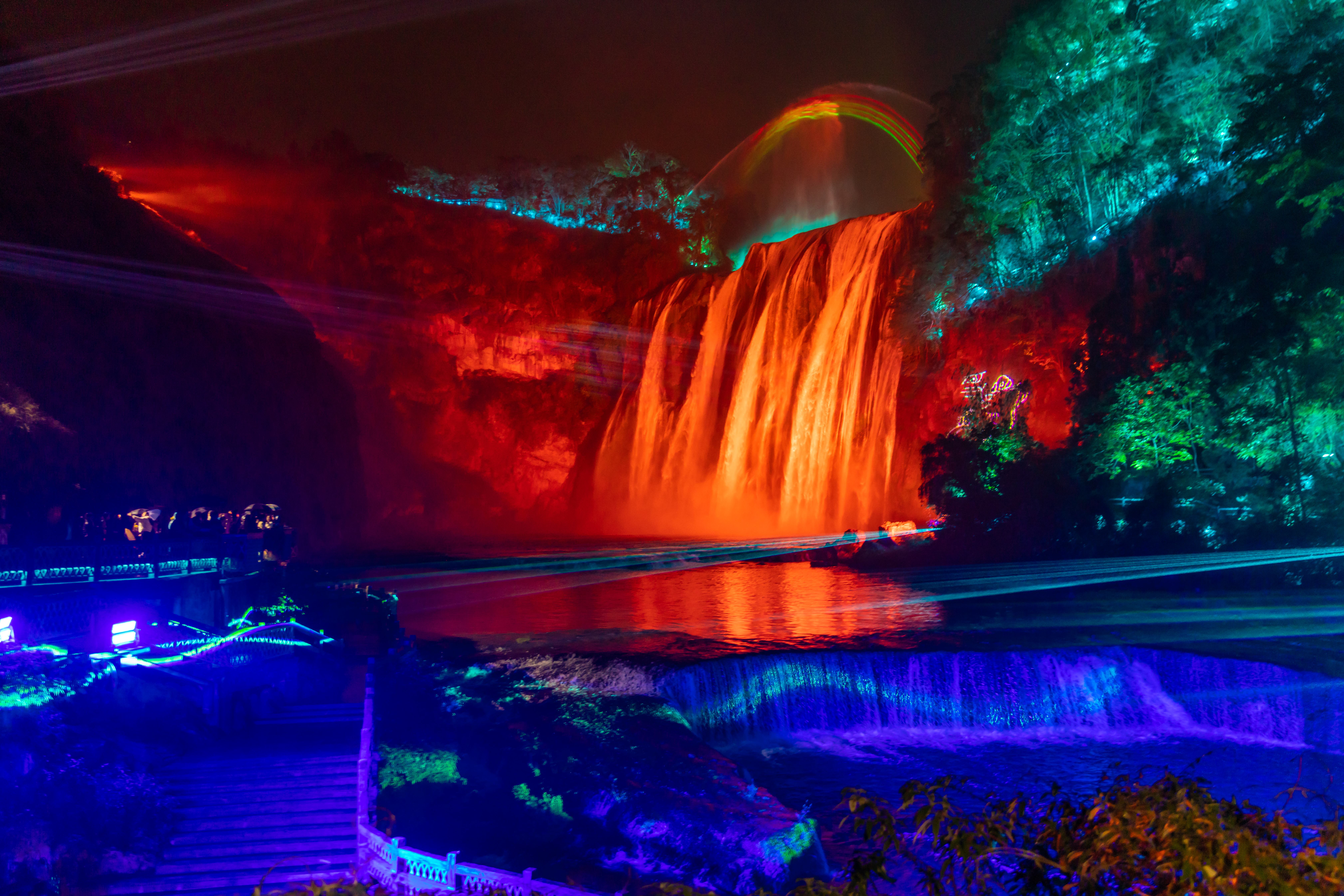 1、作为国内首个以5A级自然峡谷景区为载体打造的沉浸式光影夜游项目,黄果树大瀑布上、下,前、后、左、右均可观看,在设计和实施时也是兼顾了这个特殊属性,以整个1.5公里长的峡谷山体、河道和大瀑布营造了“旋转式全立体露天影院”,充分展现了大瀑布的磅礴气势及瑰丽绝美,为游客展现了夜间的神奇瀑布形象。