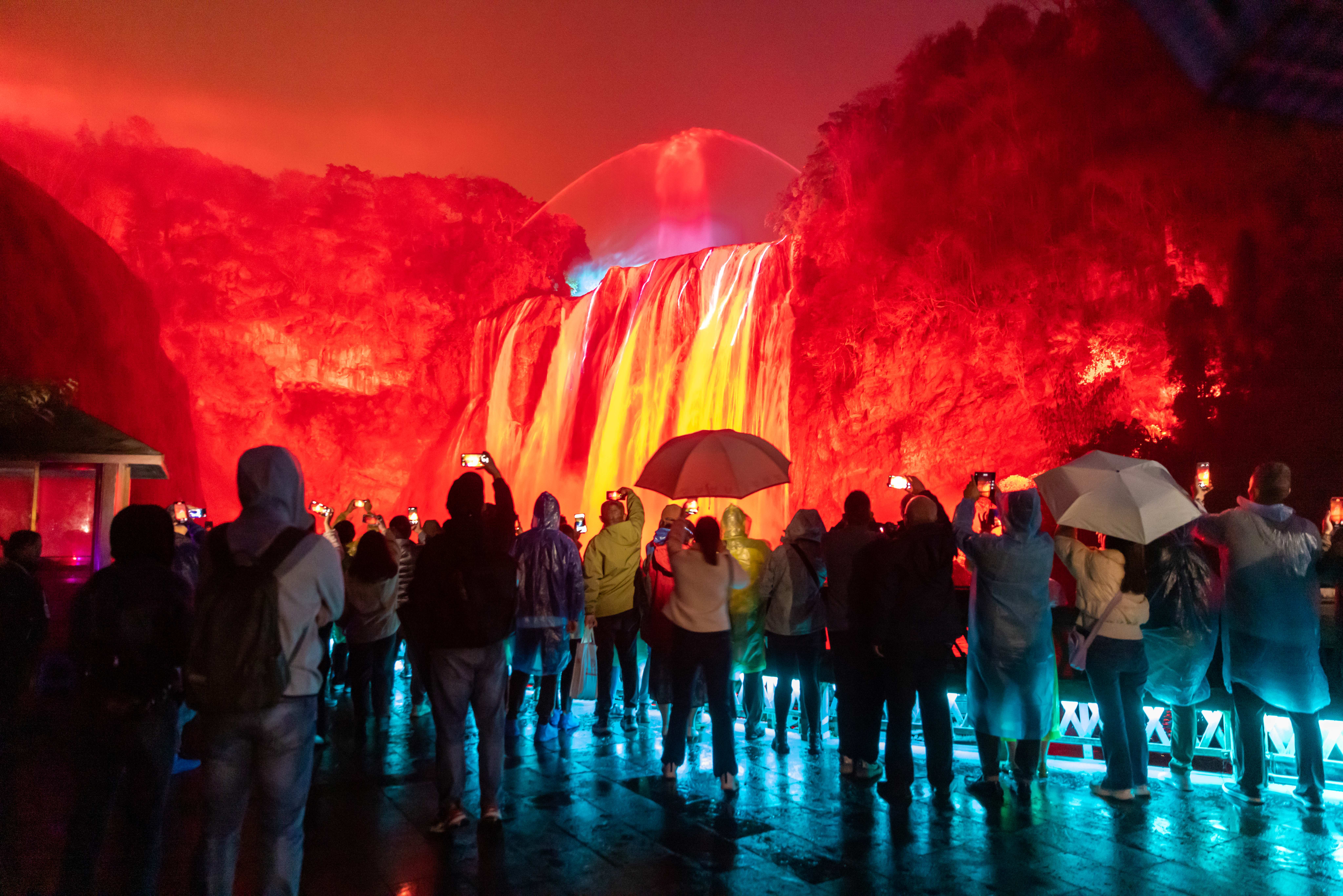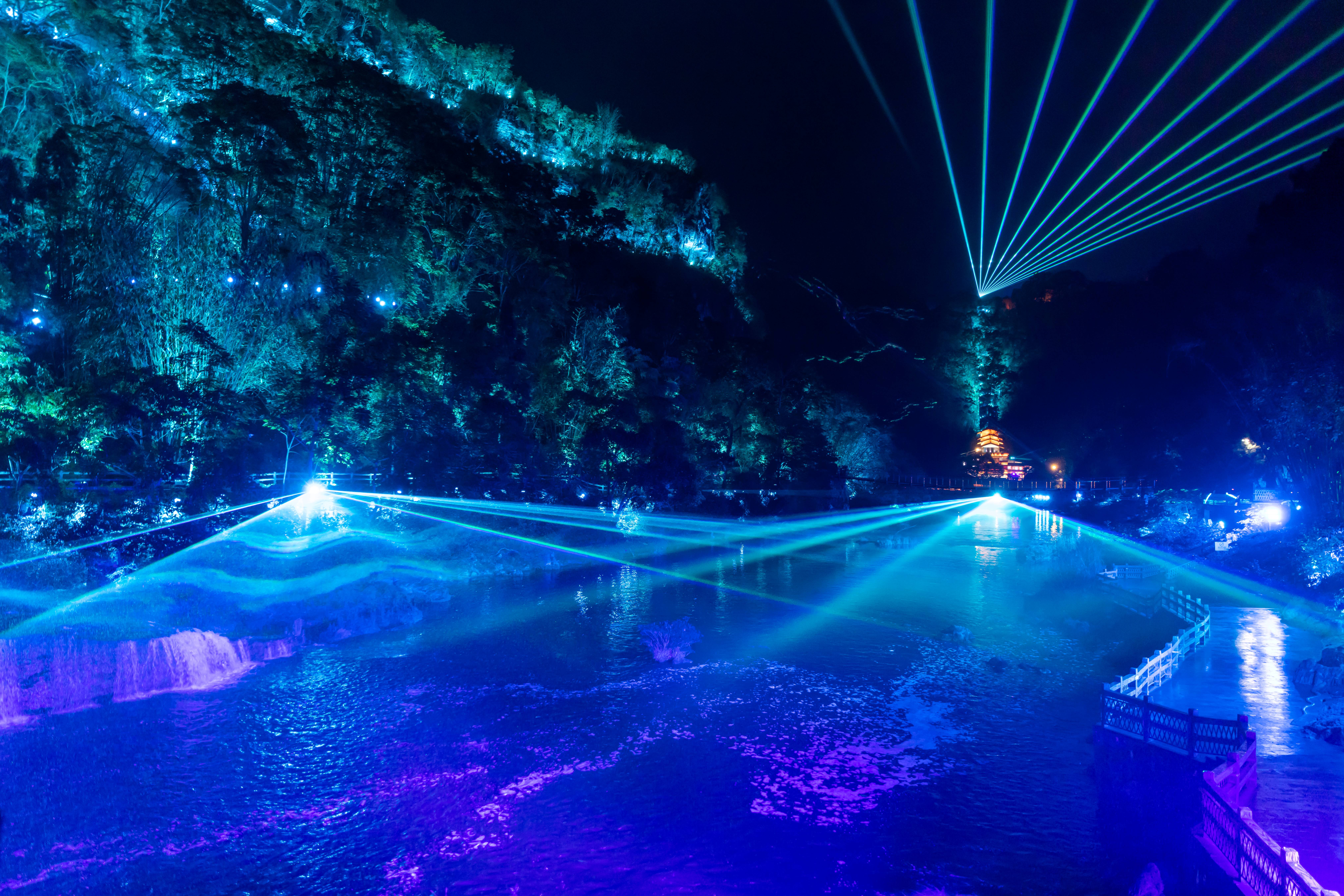5、本项目采用了全新的激光成像技术,利用24台定制40W激光灯在长1000米、高90米的瀑布、山体崖壁、树木绿化组成的“画布”上进行投射,利用专业C4D软件结合现场实际条件定制动画内容,以大场景、大画面、广视角演绎自然秘境大瀑布沧海桑田、从古至今演变的过程,凸显了大山大河的磅礴气势,展现生机盎然的神秘家园;