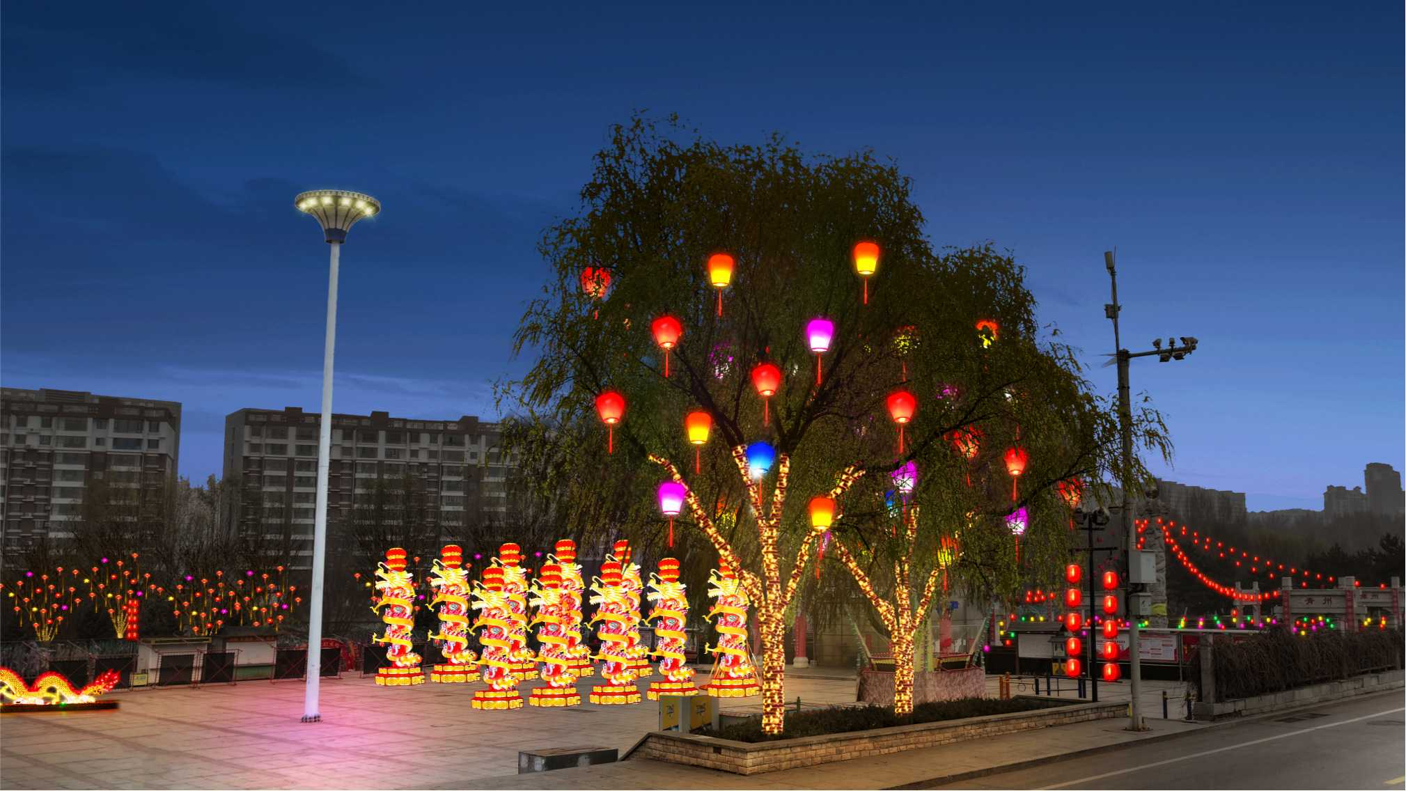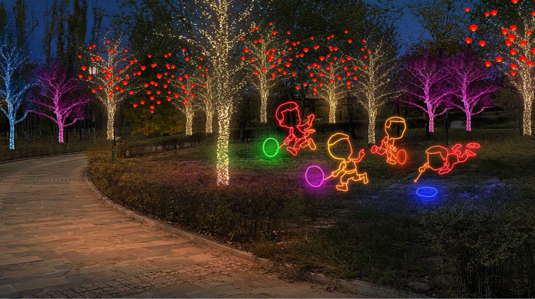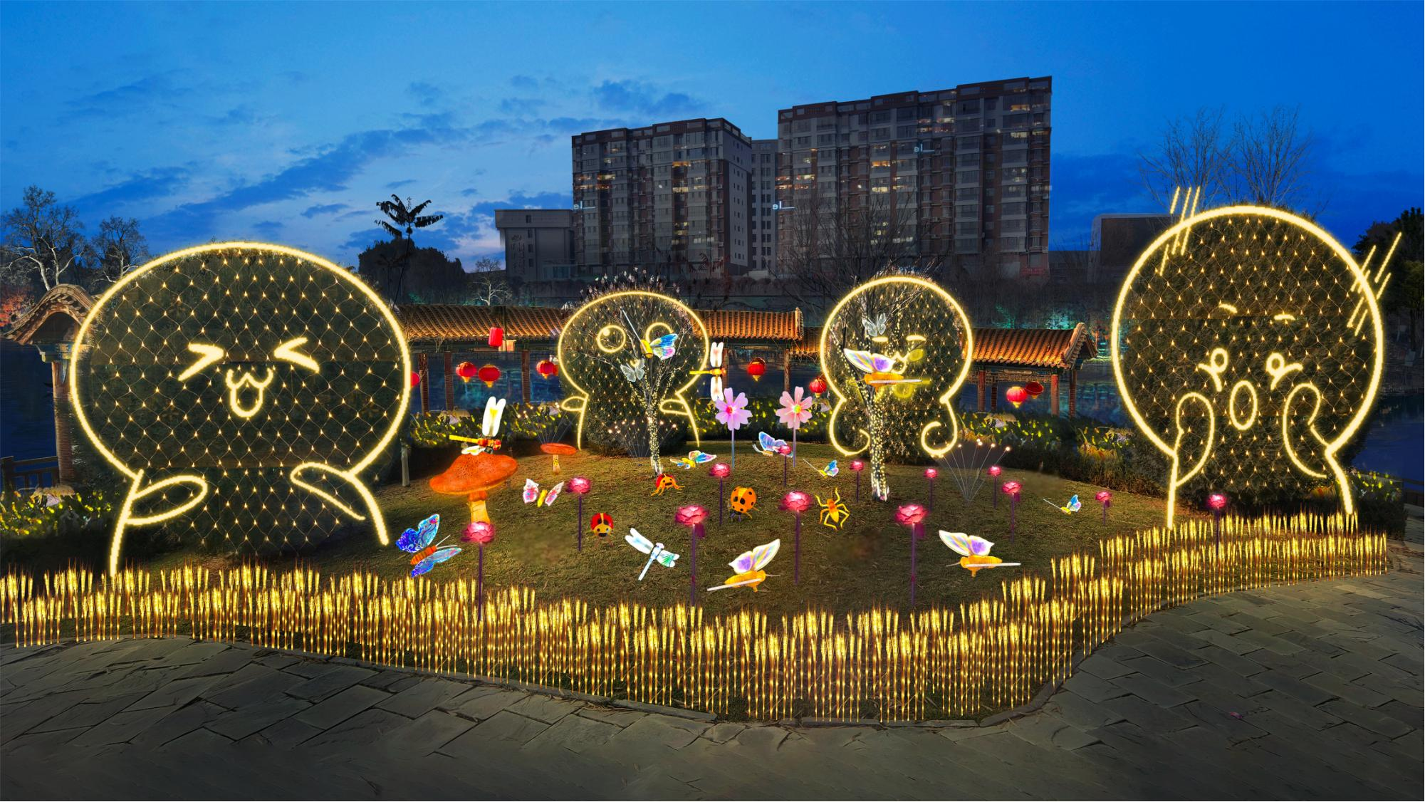 照明技术指标 : 1、显色指数:在本次亮化工程中,我们选用高显色指数(Ra≥95)的优质灯具,其能够最大限度还原物体在自然光下的真实色彩。这一特性对于文化景点和特色建筑的照明尤为重要,例如 水上公园的奇幻森林和工业园的门牌楼,高显色指数的灯光能精准展现建筑材质的纹理及装饰细节,让其原有风貌在夜晚完美呈现,为居民和游客带来高光效的视觉体验。 2、眩光控制:为营造舒适宜人的夜间光环境,本次工程在灯具选型与安装环节下了功夫。在灯具配光设计方面,采用科学合理的方案,对光线的传播路径与分布进行精确模拟、试验,力求让光线均匀地洒落在各个区域,同时最大程度避免不必要的散射,减少光污染。施工过程中,施工团队秉持着精益求精的态度,针对不同路段、不同场景的实际需求,进行反复调试。使用专业的角度测量仪器,精准设定灯具的安装角度,将眩光严格限制在规定范围内,无论是在街道上悠然漫步的行人,还是驾驶车辆穿梭于道路的司机,都不会因强光的干扰而产生视觉不适,有力地保障了夜间出行的安全与舒适。 3、核心特点: ① 文化融合:中国传统文化结合地域文化(春节元素、中华民族共同体意识)。 ② 生肖IP:2025年为蛇年,布置蛇形灯带、生肖雕塑、成为网红打卡点。 ③ LED节能化:使用12V低压LED串灯(功耗≤10W/米),相比传统白炽灯省电80%。 ④ 快装结构:灯笼挂件用卡扣式设计,单人工安装时间≤2分钟/个。 ⑤ 模块化网片:3m×2m网片灯预制成型,直接套挂树冠。 ⑥ 防坠落设计:超过2米的挂件使用双挂钩+钢丝绳加固。 ⑦ 防水等级:IP65(可防暴雪),低温环境(-25℃)正常工作。 ⑧ 承重测试:单灯笼挂件承重≥5kg(抗风等级≥6级)。 电路保护:漏电保护器+过载保护,每50米线路配独立配电箱。