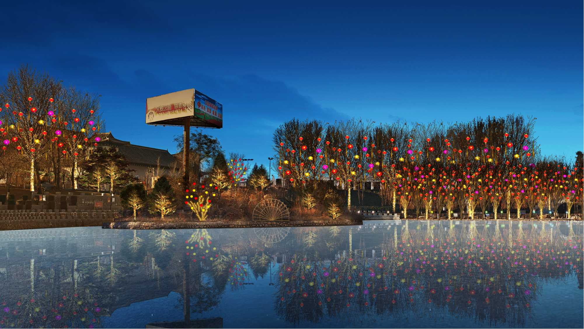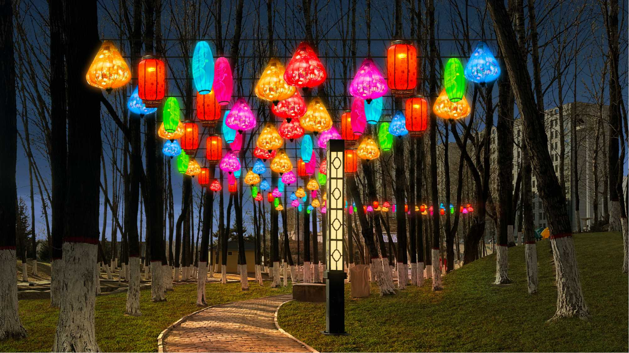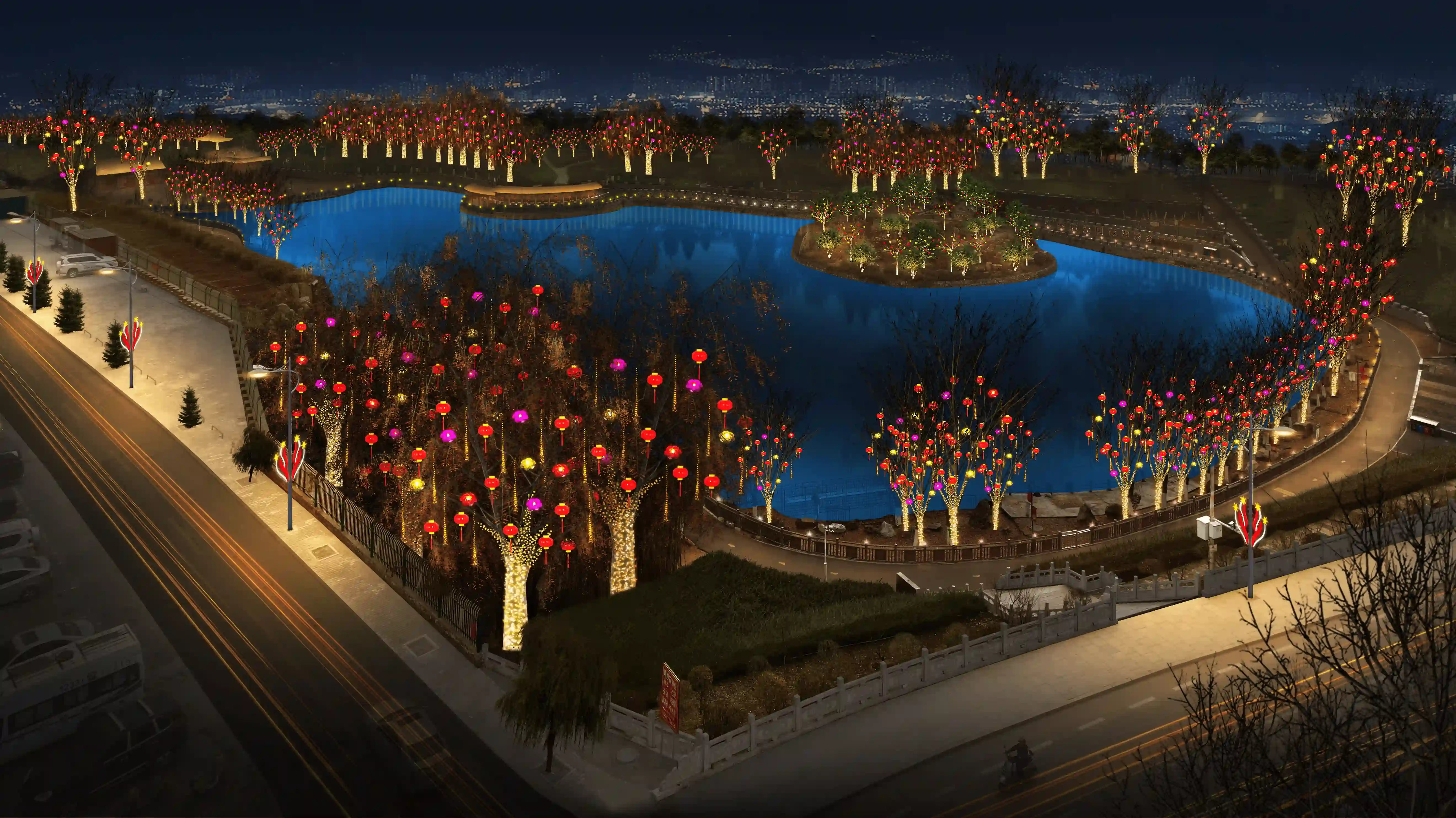 照明技术指标 : 1、显色指数:在本次亮化工程中,我们选用高显色指数(Ra≥95)的优质灯具,其能够最大限度还原物体在自然光下的真实色彩。这一特性对于文化景点和特色建筑的照明尤为重要,例如 水上公园的奇幻森林和工业园的门牌楼,高显色指数的灯光能精准展现建筑材质的纹理及装饰细节,让其原有风貌在夜晚完美呈现,为居民和游客带来高光效的视觉体验。 2、眩光控制:为营造舒适宜人的夜间光环境,本次工程在灯具选型与安装环节下了功夫。在灯具配光设计方面,采用科学合理的方案,对光线的传播路径与分布进行精确模拟、试验,力求让光线均匀地洒落在各个区域,同时最大程度避免不必要的散射,减少光污染。施工过程中,施工团队秉持着精益求精的态度,针对不同路段、不同场景的实际需求,进行反复调试。使用专业的角度测量仪器,精准设定灯具的安装角度,将眩光严格限制在规定范围内,无论是在街道上悠然漫步的行人,还是驾驶车辆穿梭于道路的司机,都不会因强光的干扰而产生视觉不适,有力地保障了夜间出行的安全与舒适。 3、核心特点: ① 文化融合:中国传统文化结合地域文化(春节元素、中华民族共同体意识)。 ② 生肖IP:2025年为蛇年,布置蛇形灯带、生肖雕塑、成为网红打卡点。 ③ LED节能化:使用12V低压LED串灯(功耗≤10W/米),相比传统白炽灯省电80%。 ④ 快装结构:灯笼挂件用卡扣式设计,单人工安装时间≤2分钟/个。 ⑤ 模块化网片:3m×2m网片灯预制成型,直接套挂树冠。 ⑥ 防坠落设计:超过2米的挂件使用双挂钩+钢丝绳加固。 ⑦ 防水等级:IP65(可防暴雪),低温环境(-25℃)正常工作。 ⑧ 承重测试:单灯笼挂件承重≥5kg(抗风等级≥6级)。 电路保护:漏电保护器+过载保护,每50米线路配独立配电箱。