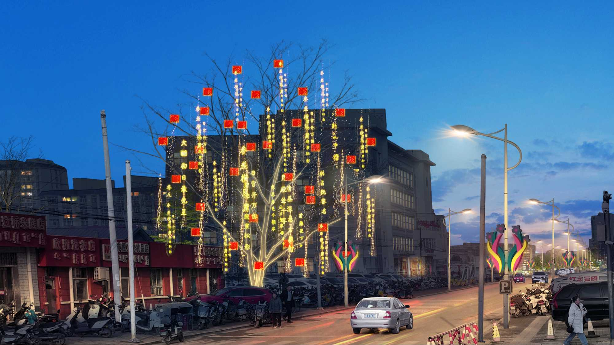 ④空间设计考虑到广场、公园、路口及其他重要节点的打造,和城市主要街道的氛围设计,点、线、面结合,重点突出、适度覆盖,制定科学合理的春节亮化整体布局规划。