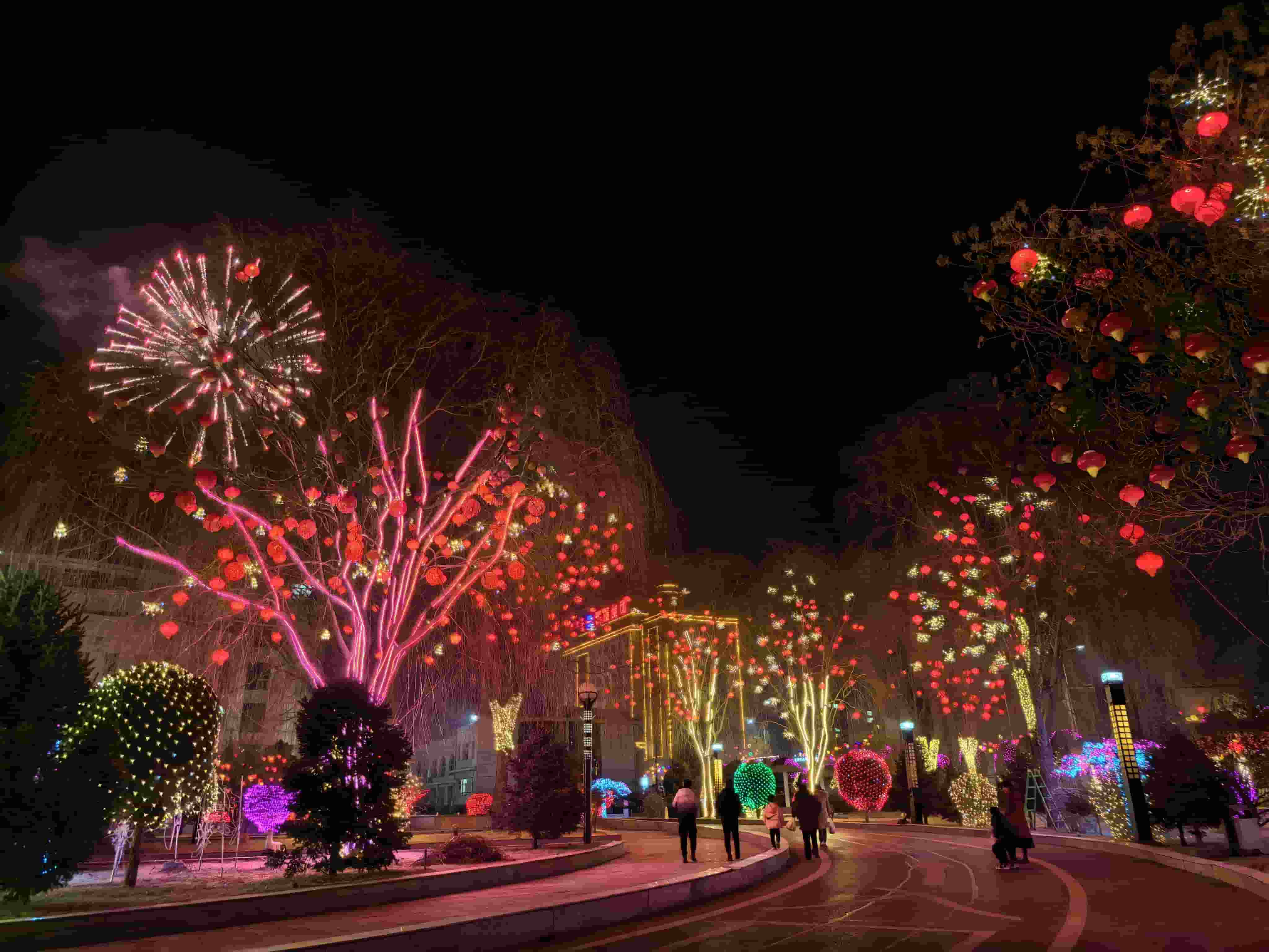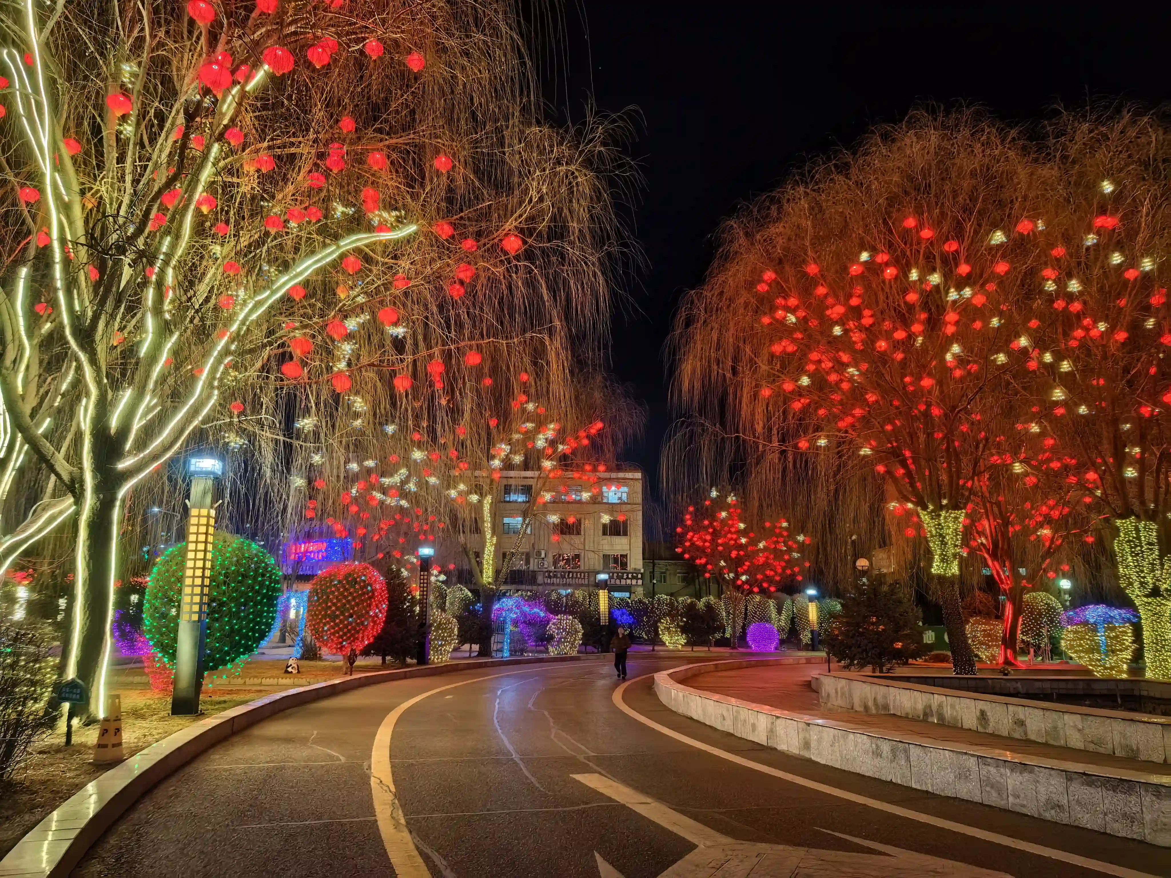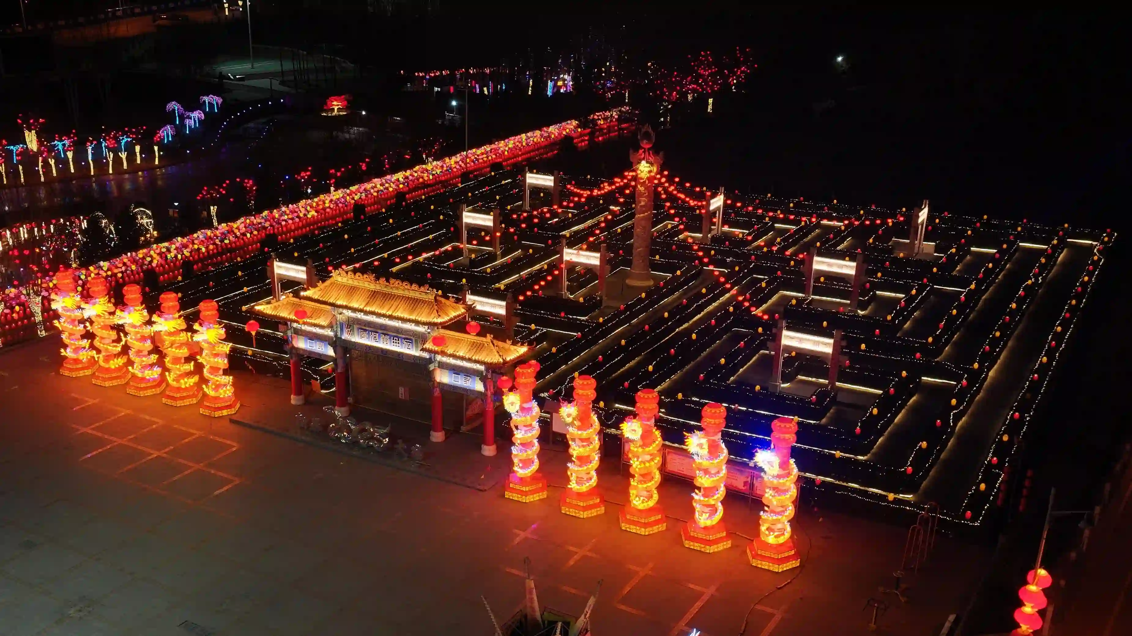 由城市主要出入口作为赏灯的起点,用各种造型的灯笼、中国结、对联等灯具挂件来装饰道路中间及两侧现有的绿植,昼夜均有效果,极大地提升了视觉体验;在主要道路设置跨街天幕,并用网灯铺设绿篱,配色大气华美,俯瞰逶迤绵延;在广场精心设置数个引流打卡点,成为在过年时极具年味儿的“城市会客厅”,丰富市民节日期间的文娱生活,织就璀璨华章,共绘夜色斑斓。
