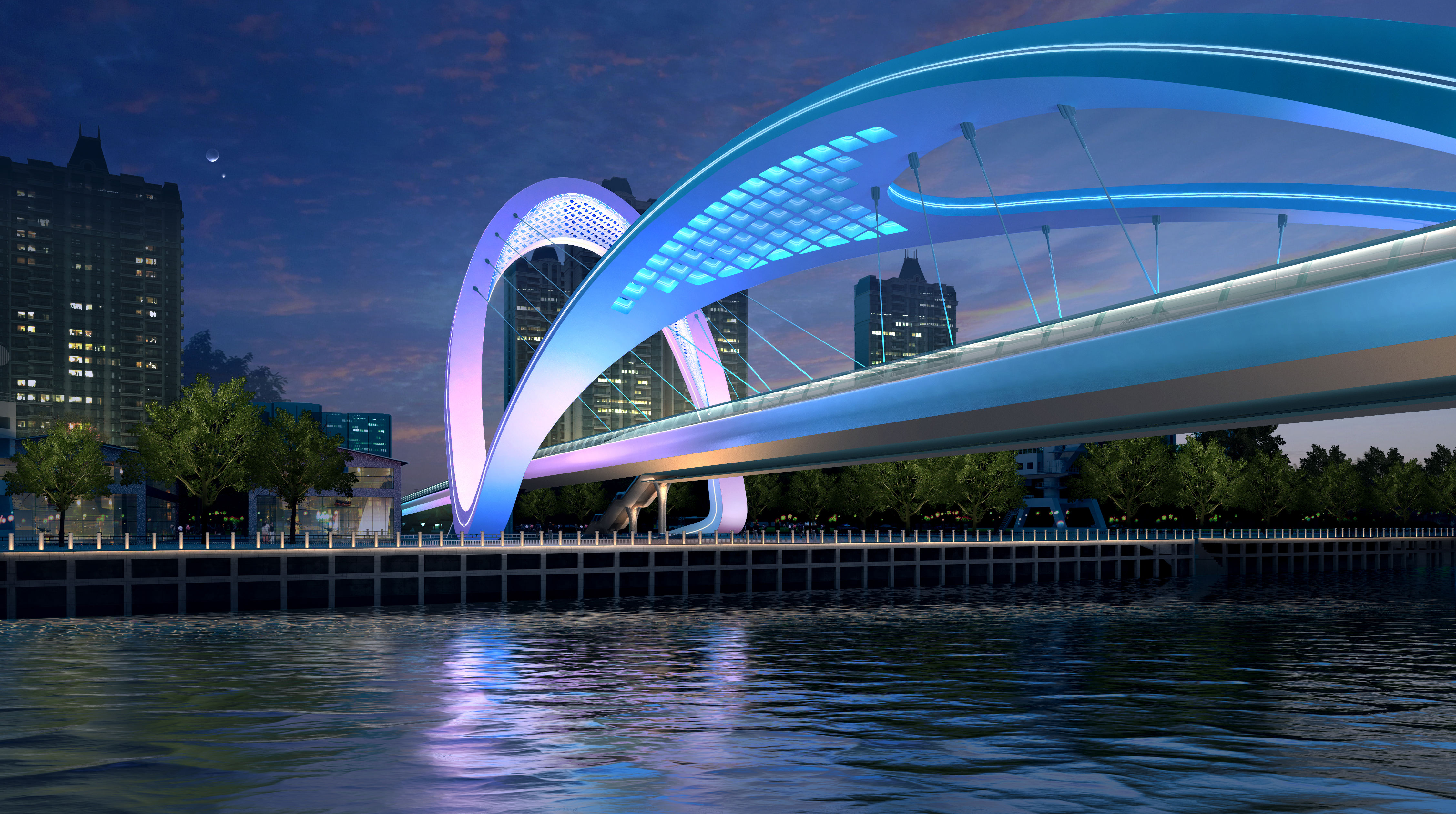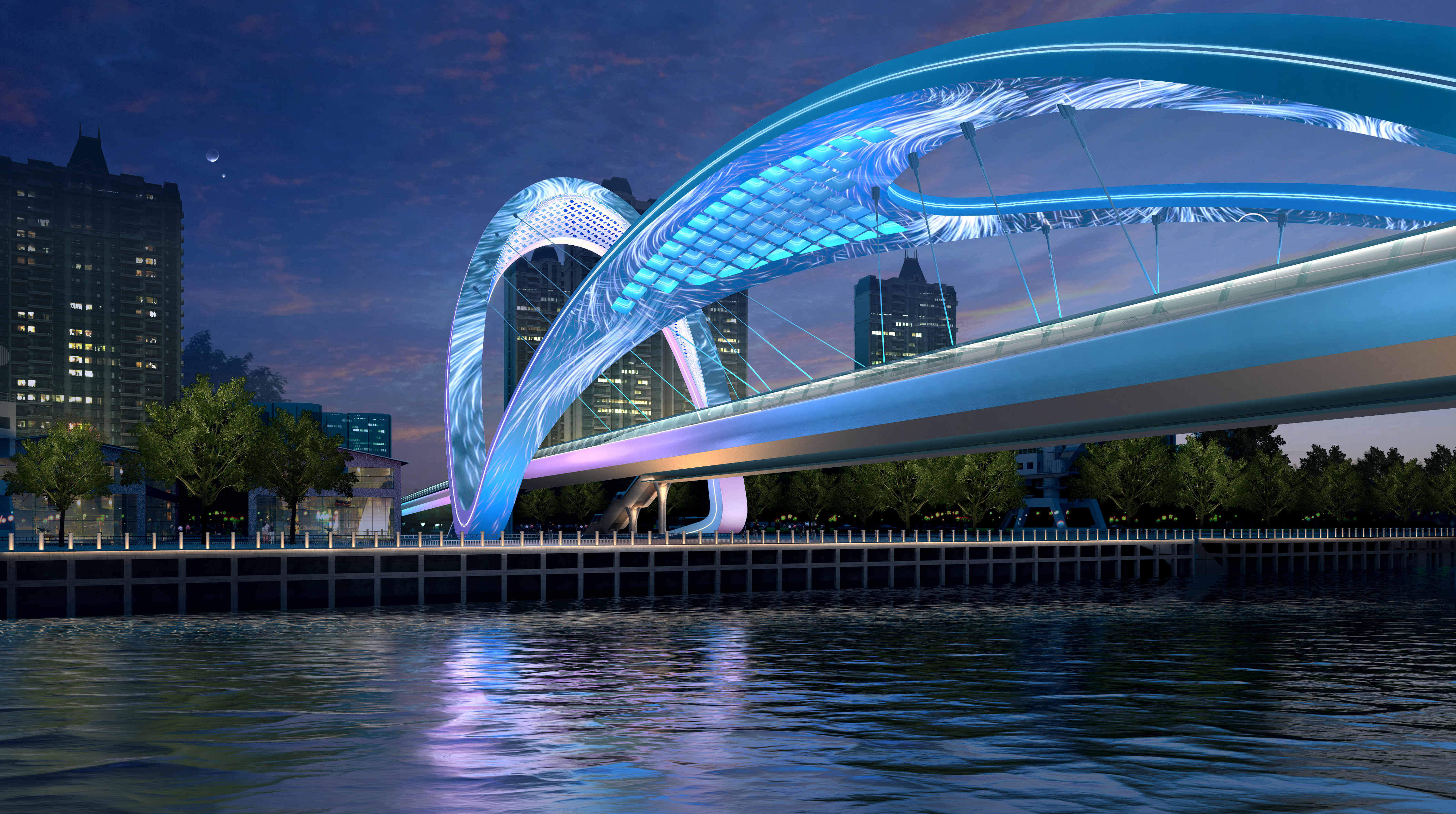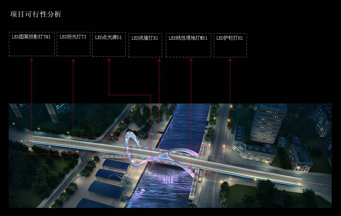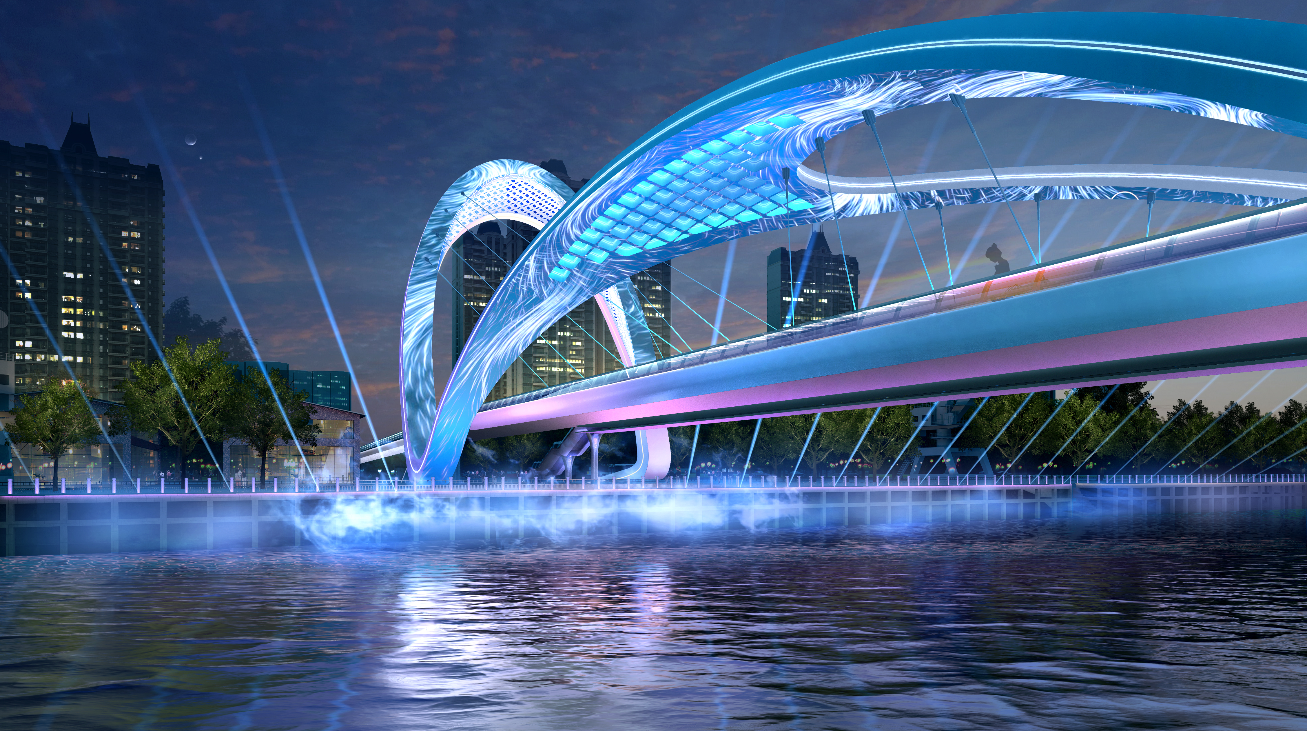 设计亮点:桥下护栏空间设置“微波测距感应护栏装置”光随人走动而同步变化,桥上的投影,设置没有人经过底下时,为静态或者缓慢动态的变化模式,当有人经过区域时,投影区域的色彩及图形发生变化,与之互动,但频率不能影响行车安全,人仿佛走进了梦幻世界,聆听着流动的音符,光与影,重现地域历史文化,重拾这座城市对于它的记忆,将串成两岸的魅力动线,打造美丽生态长廊,建造一座最具人气与活力的城市枢纽。
