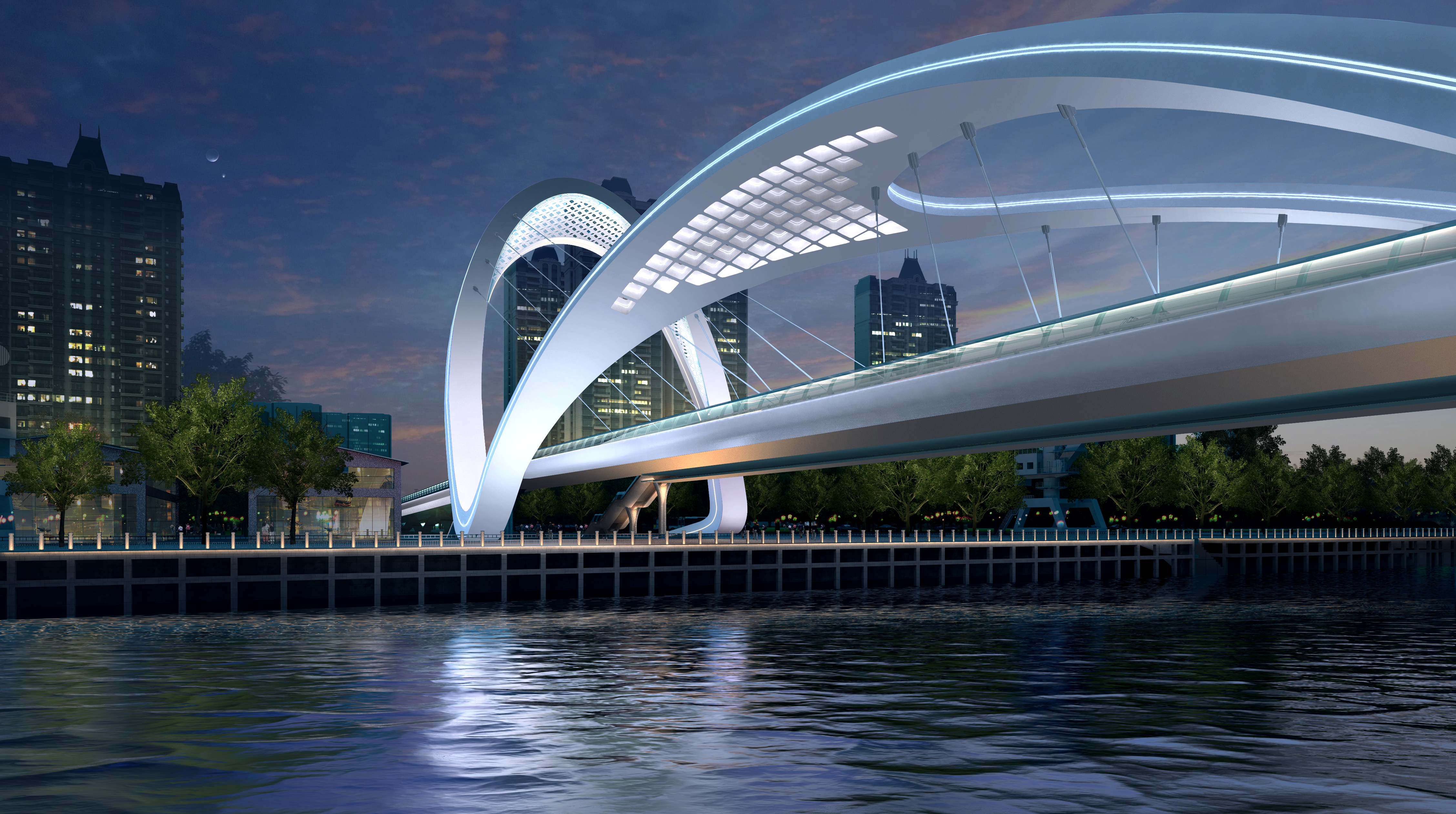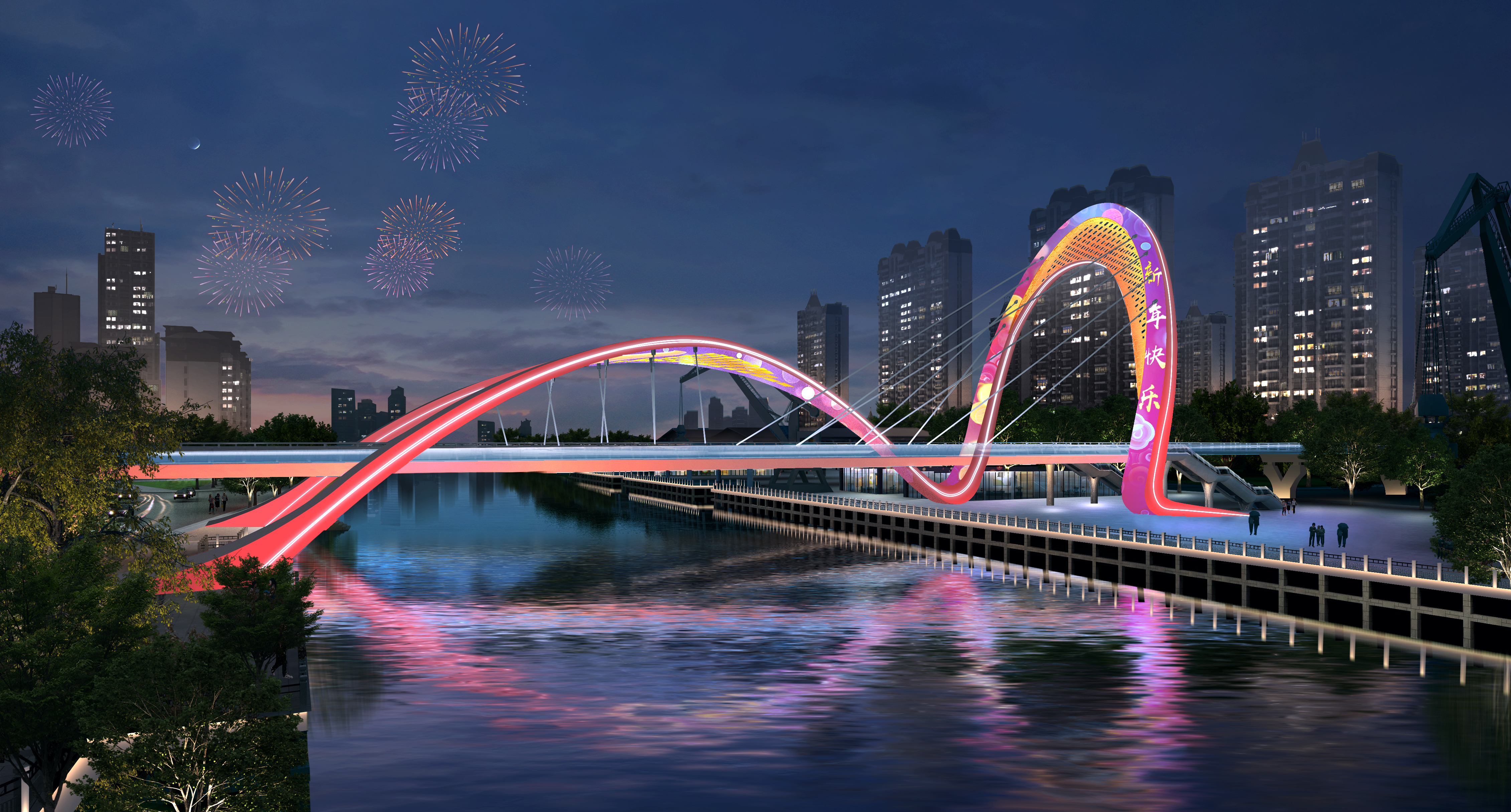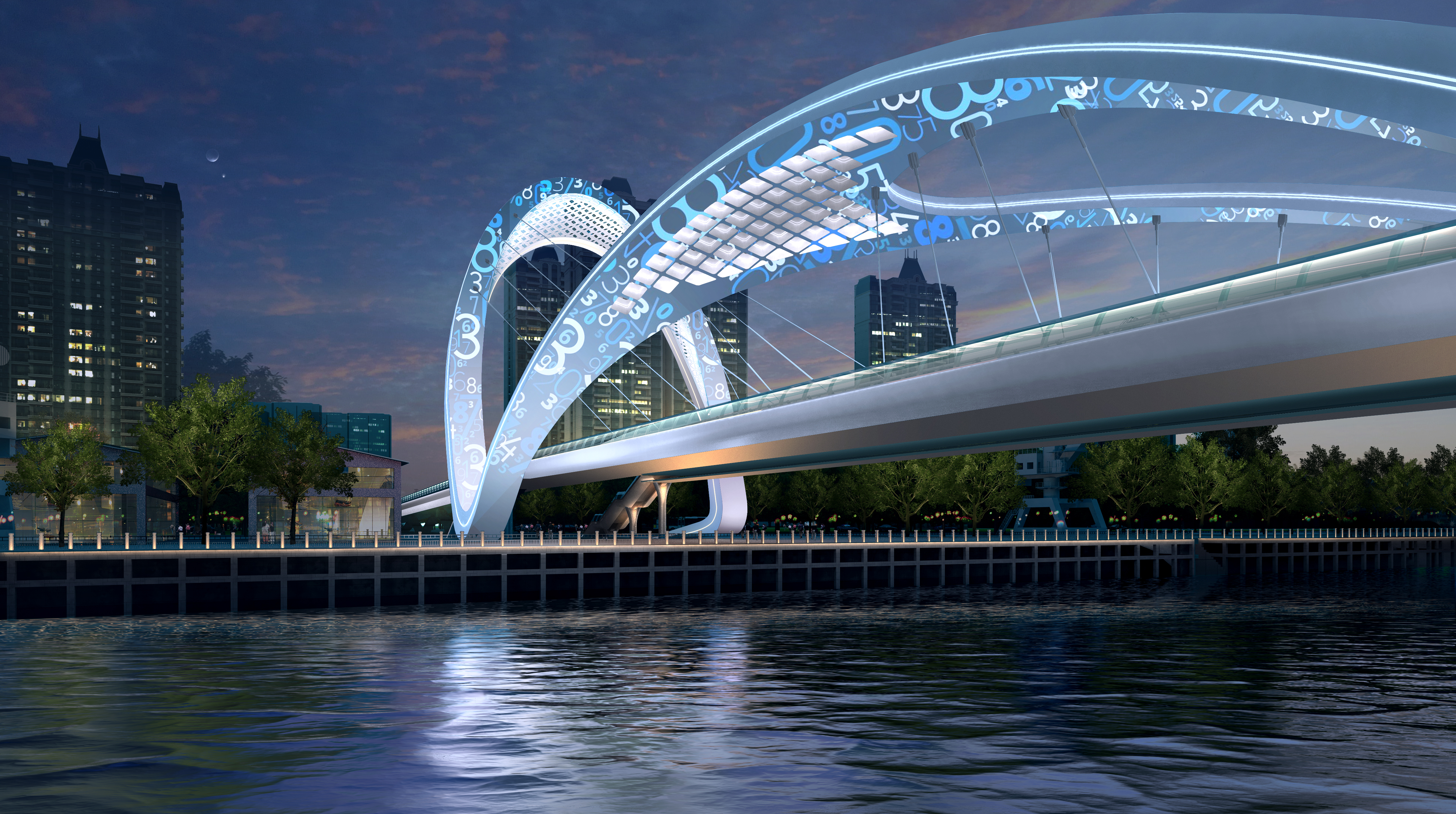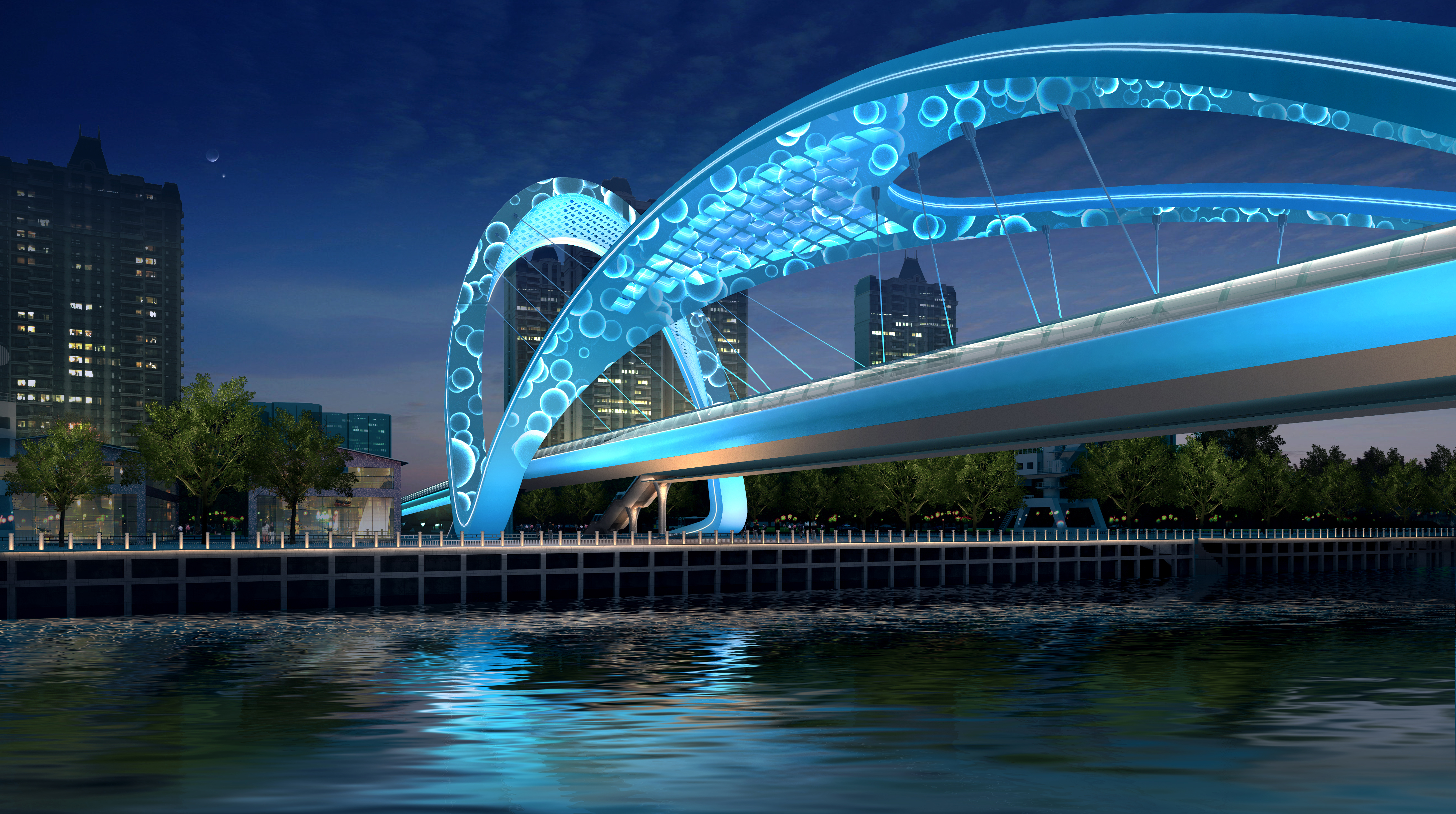 设计亮点:桥下护栏空间设置“微波测距感应护栏装置”光随人走动而同步变化,桥上的投影,设置没有人经过底下时,为静态或者缓慢动态的变化模式,当有人经过区域时,投影区域的色彩及图形发生变化,与之互动,但频率不能影响行车安全,人仿佛走进了梦幻世界,聆听着流动的音符,光与影,重现地域历史文化,重拾这座城市对于它的记忆,将串成两岸的魅力动线,打造美丽生态长廊,建造一座最具人气与活力的城市枢纽。