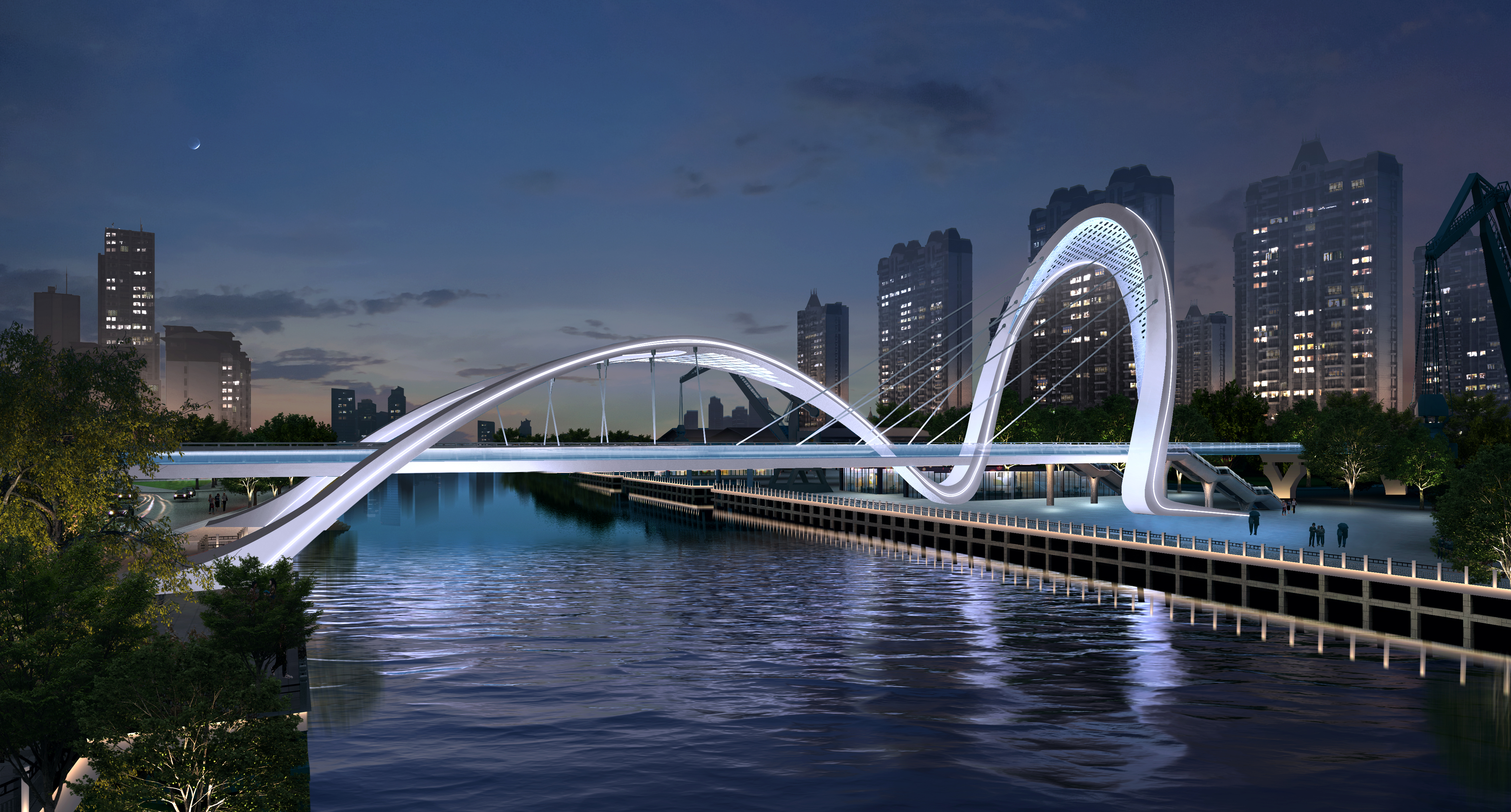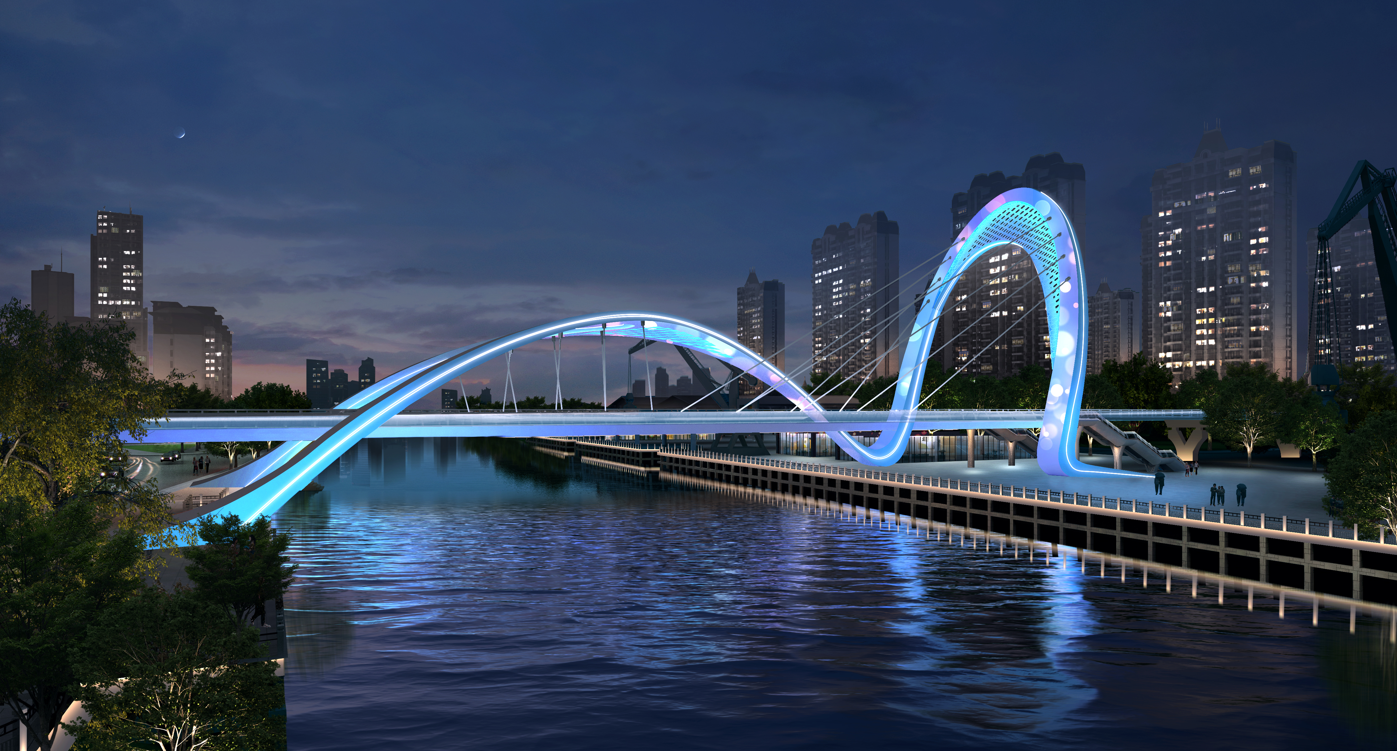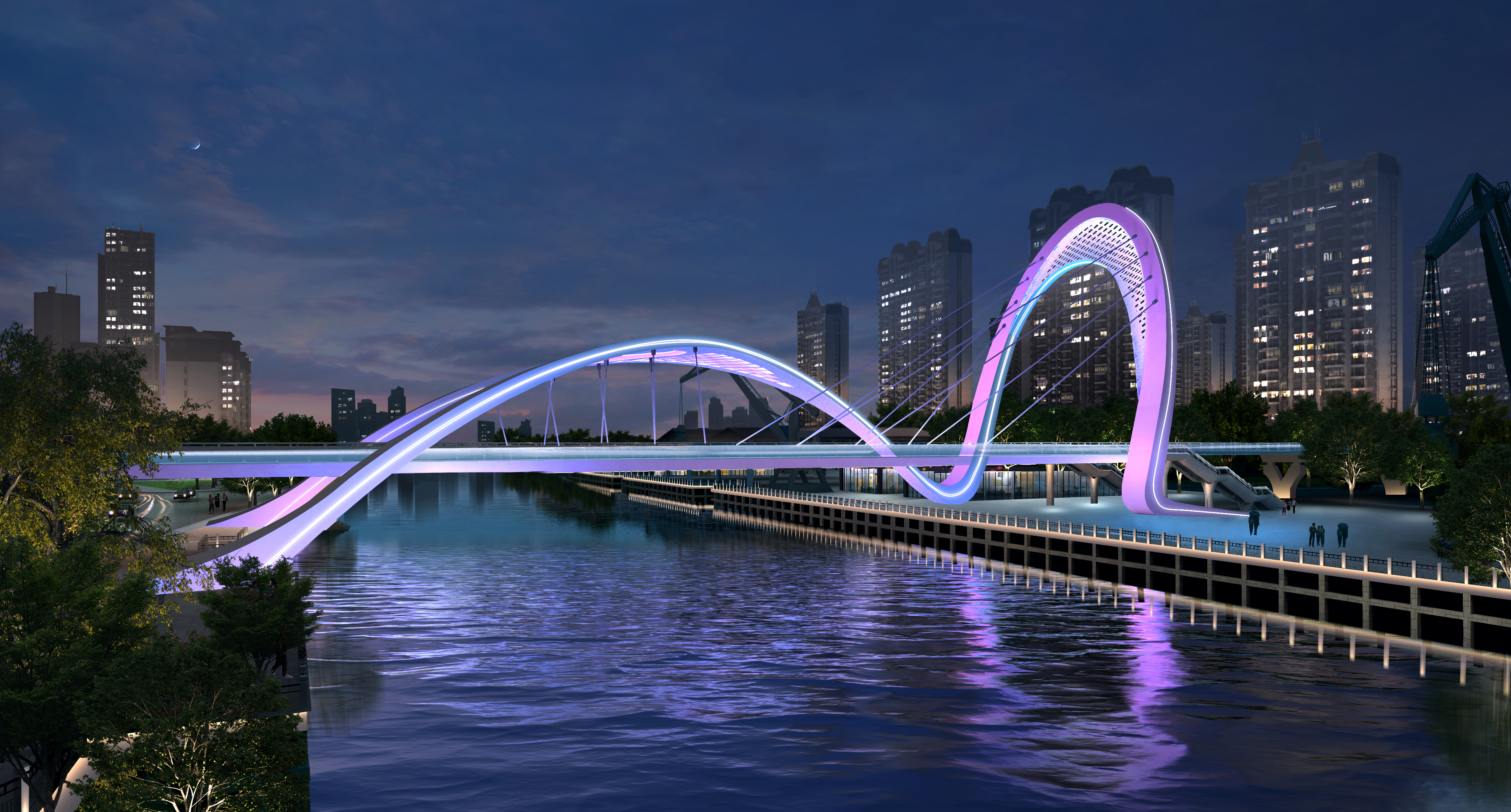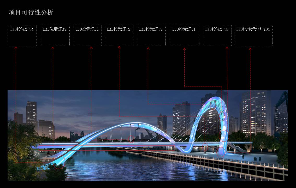 设计亮点:桥下护栏空间设置“微波测距感应护栏装置”光随人走动而同步变化,桥上的投影,设置没有人经过底下时,为静态或者缓慢动态的变化模式,当有人经过区域时,投影区域的色彩及图形发生变化,与之互动,但频率不能影响行车安全,人仿佛走进了梦幻世界,聆听着流动的音符,光与影,重现地域历史文化,重拾这座城市对于它的记忆,将串成两岸的魅力动线,打造美丽生态长廊,建造一座最具人气与活力的城市枢纽。