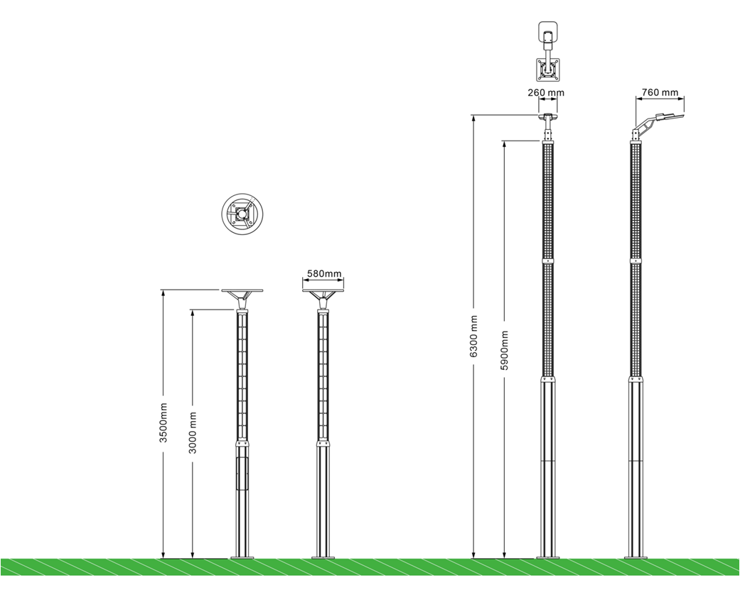 2、结构、材质:标准产品不管是3.5M还是6M光伏路灯,均采用分段式的组装结构,在产品标准化以及产品运输上均能达到便捷使用的目的。整灯主体采用铝合金材质,储能和控制系统置于杆体内,防护等级高,不惧日晒、雨淋、浸水。铝合金灯壳于散热鳍片一体成型,使灯具散热效果佳。