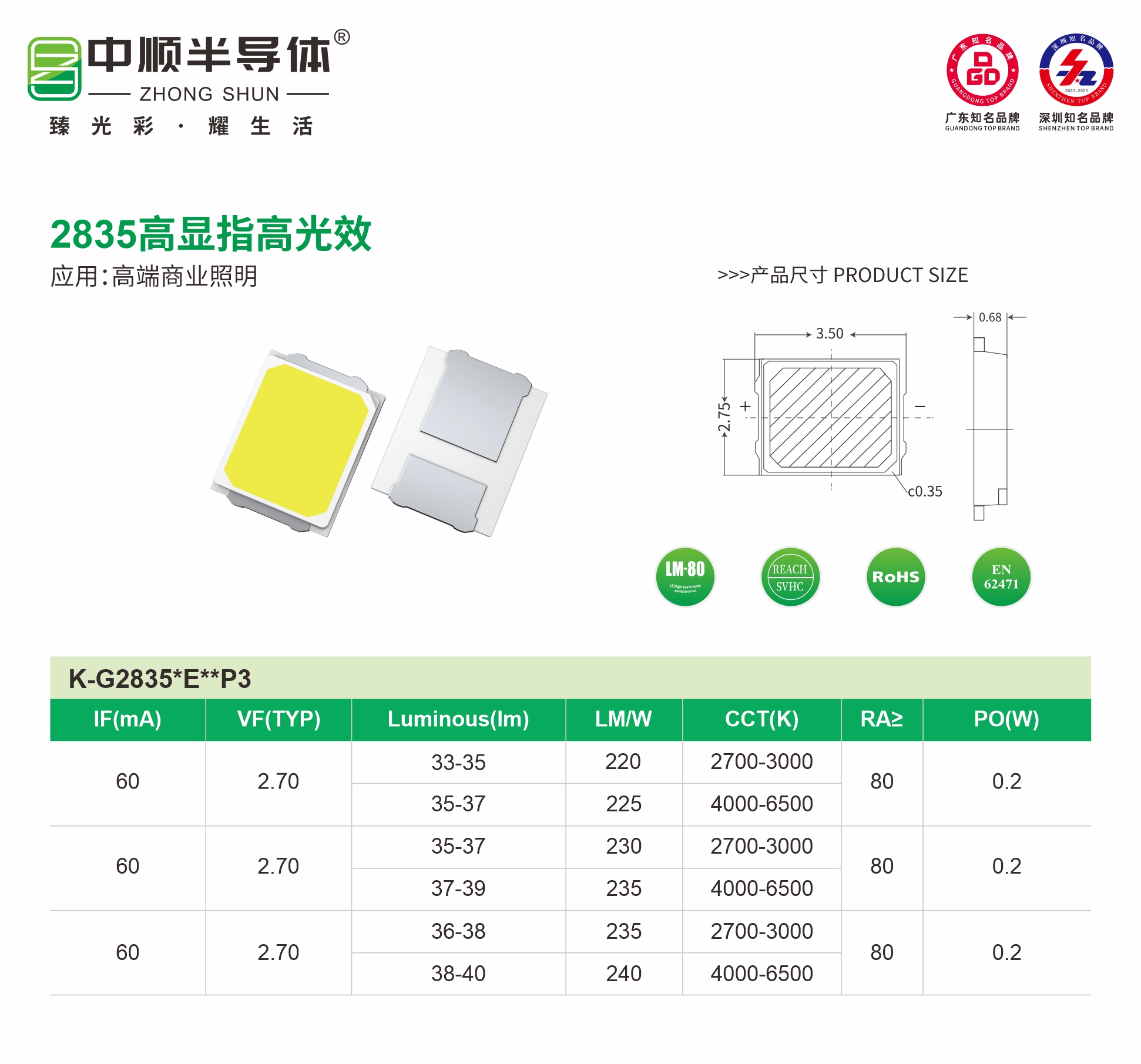 高端室内照明2835K系列高光效产品与普通室内照明2835系列产品相比,在光效方面有着非常大的优势,对于同类高光效产品,其价格优势明显。结合中顺半导体高端LED敏捷智造系统,为行业探索了新的发展方向。