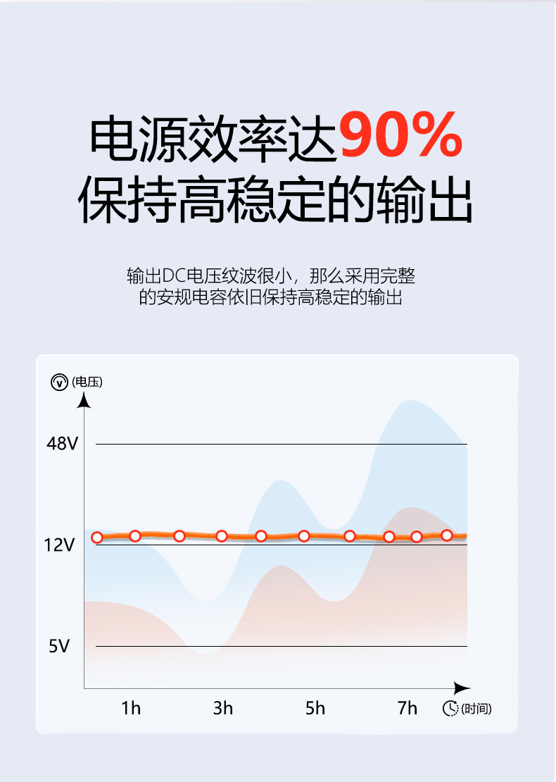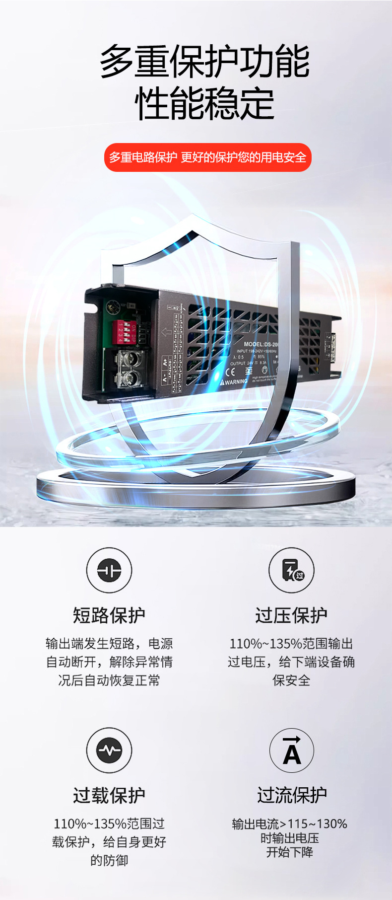 多重电路保护 ——绝缘性好、抗电强度高、软启动电流设计、有效降低AC输入冲击
